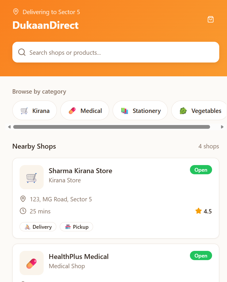 Dukaan Direct is a comprehensive hyperlocal e-commerce platform that connects customers with nearby shops for instant delivery. The platform features: