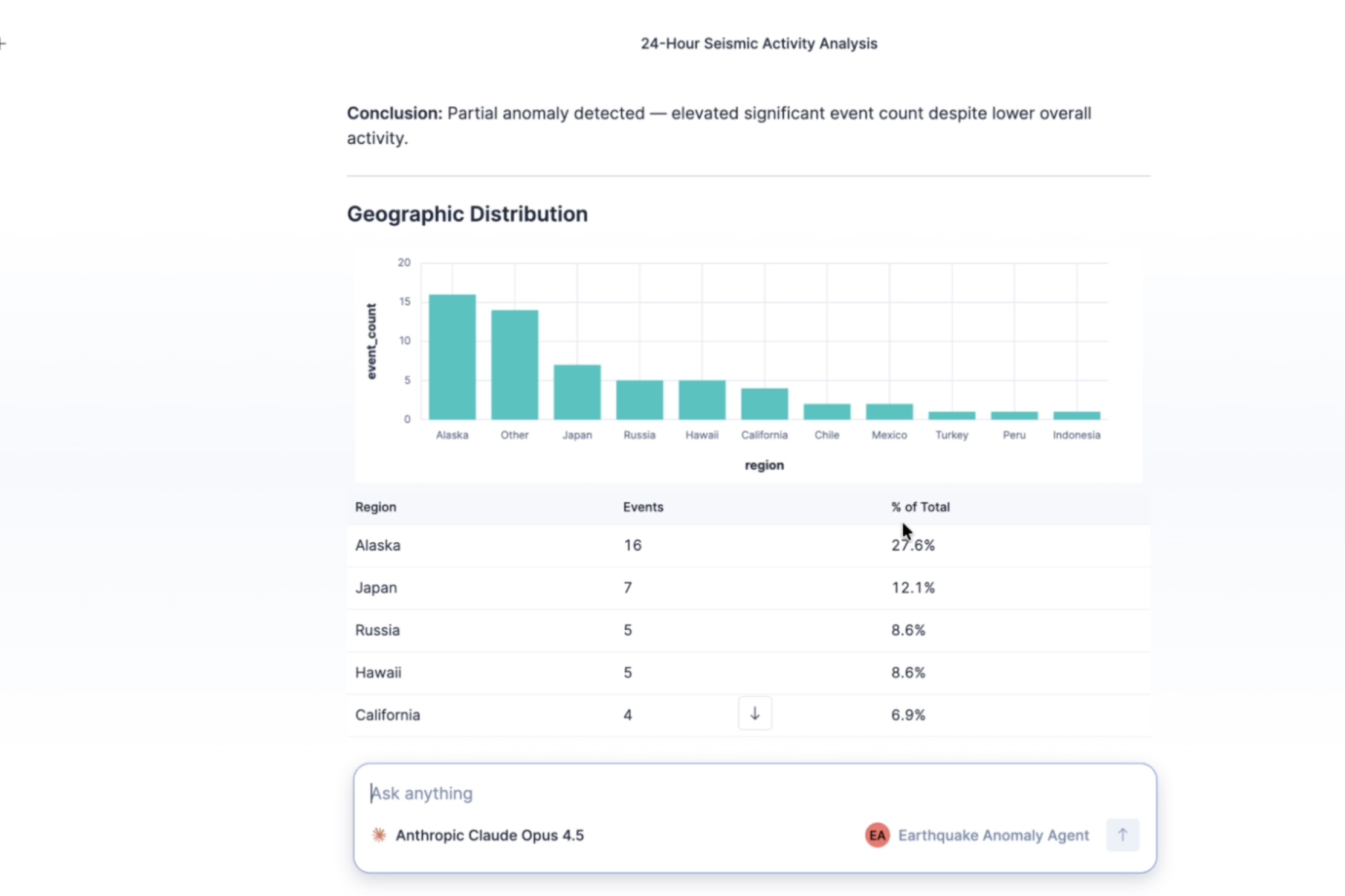 Earthquake Anomaly Agent monitors indexed seismic data and automatically detects abnormal behavior such as: