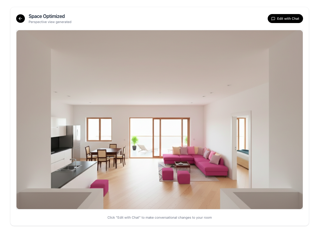 - Refine: Lets users chat with the design (e.g., "swap the sofa for a sectional") to make instant updates.