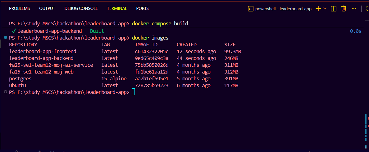 docker-compose build, leaderboard-app-frontend and backend images built successfully.