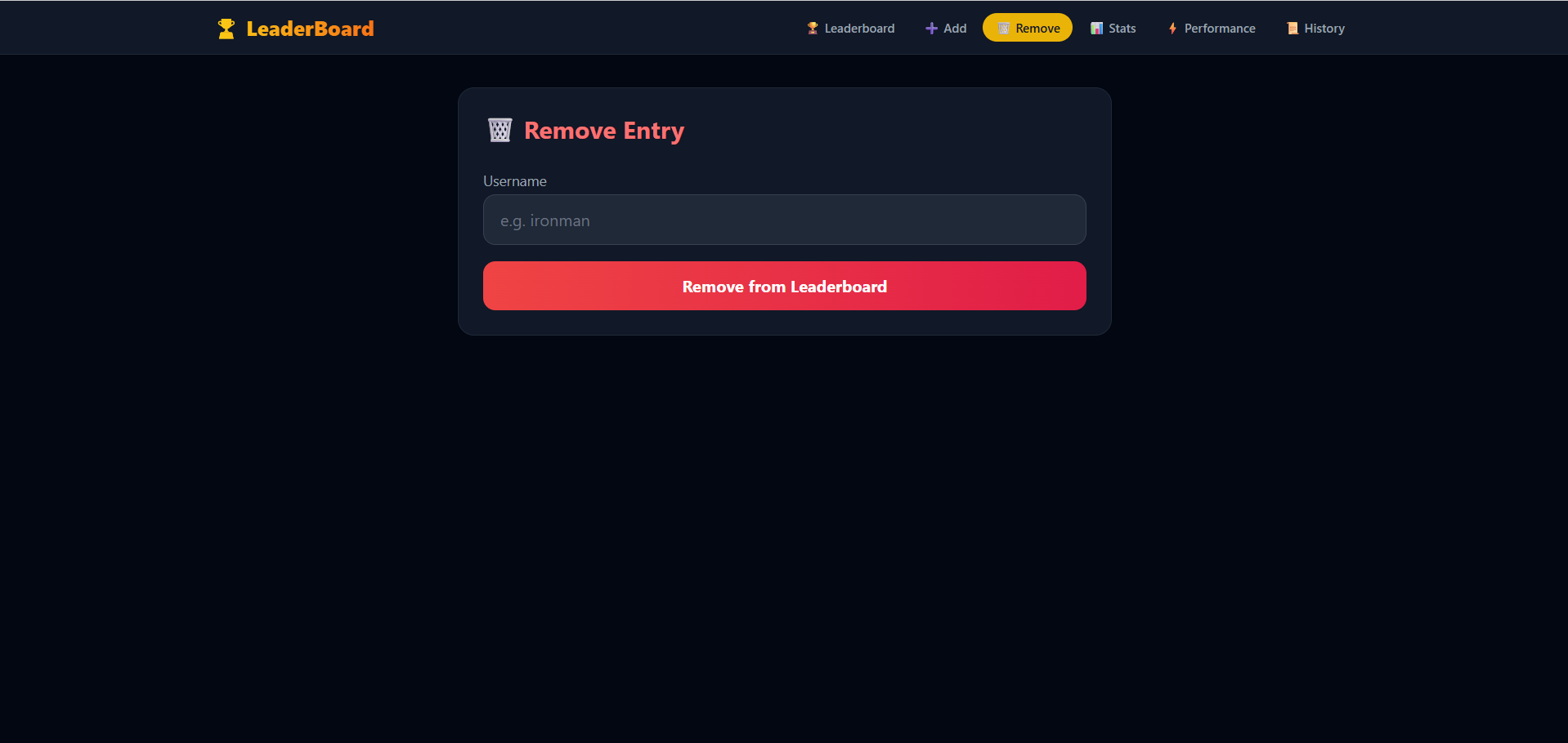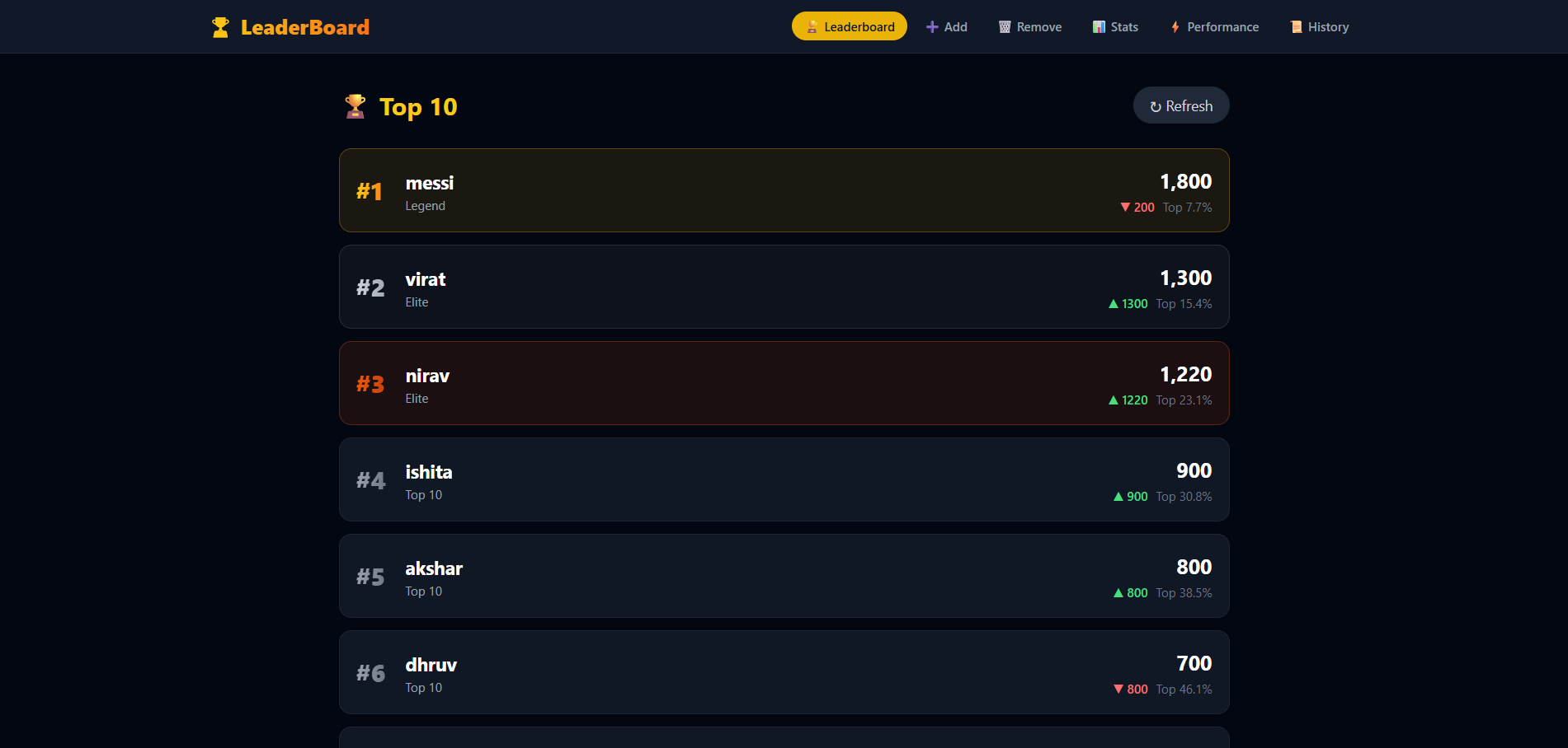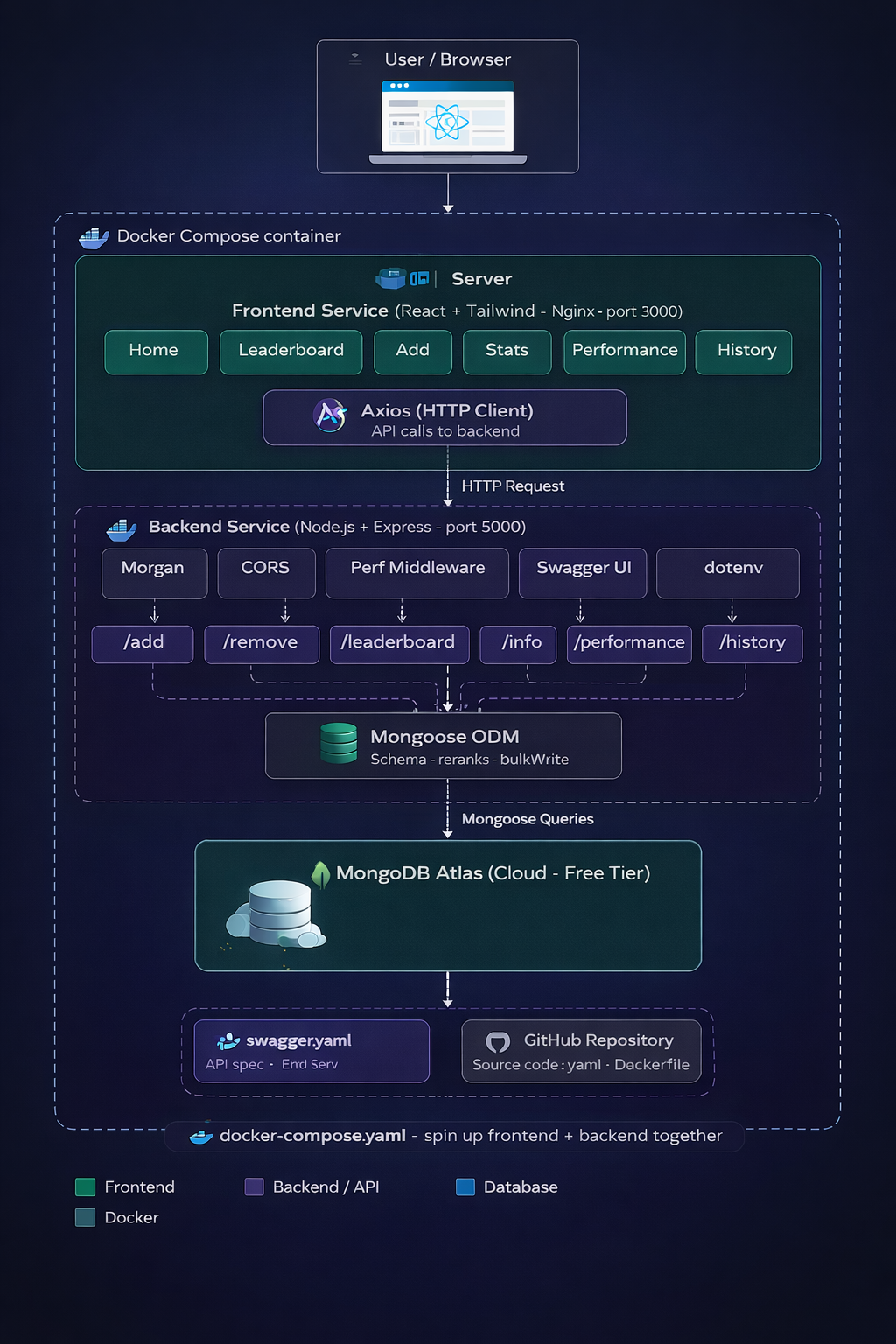 - Backend: Node.js + Express.js REST API with 6 endpoints (/add, /remove, /leaderboard, /info, /performance, /history)
