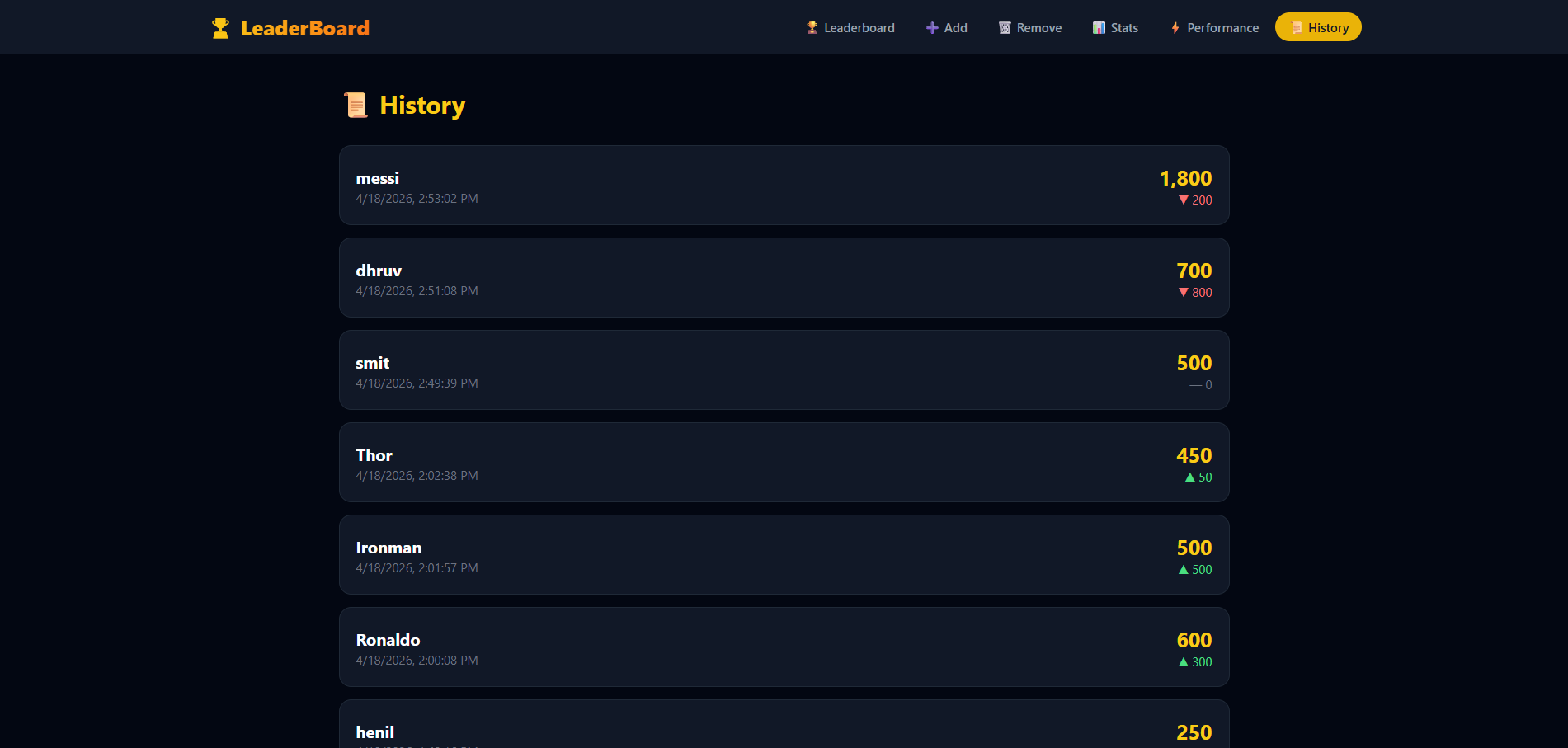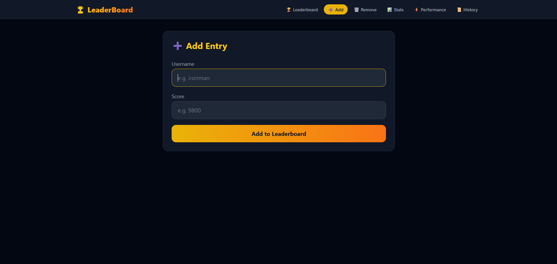 Add any player with a username and score which instantly updates the live leaderboard.