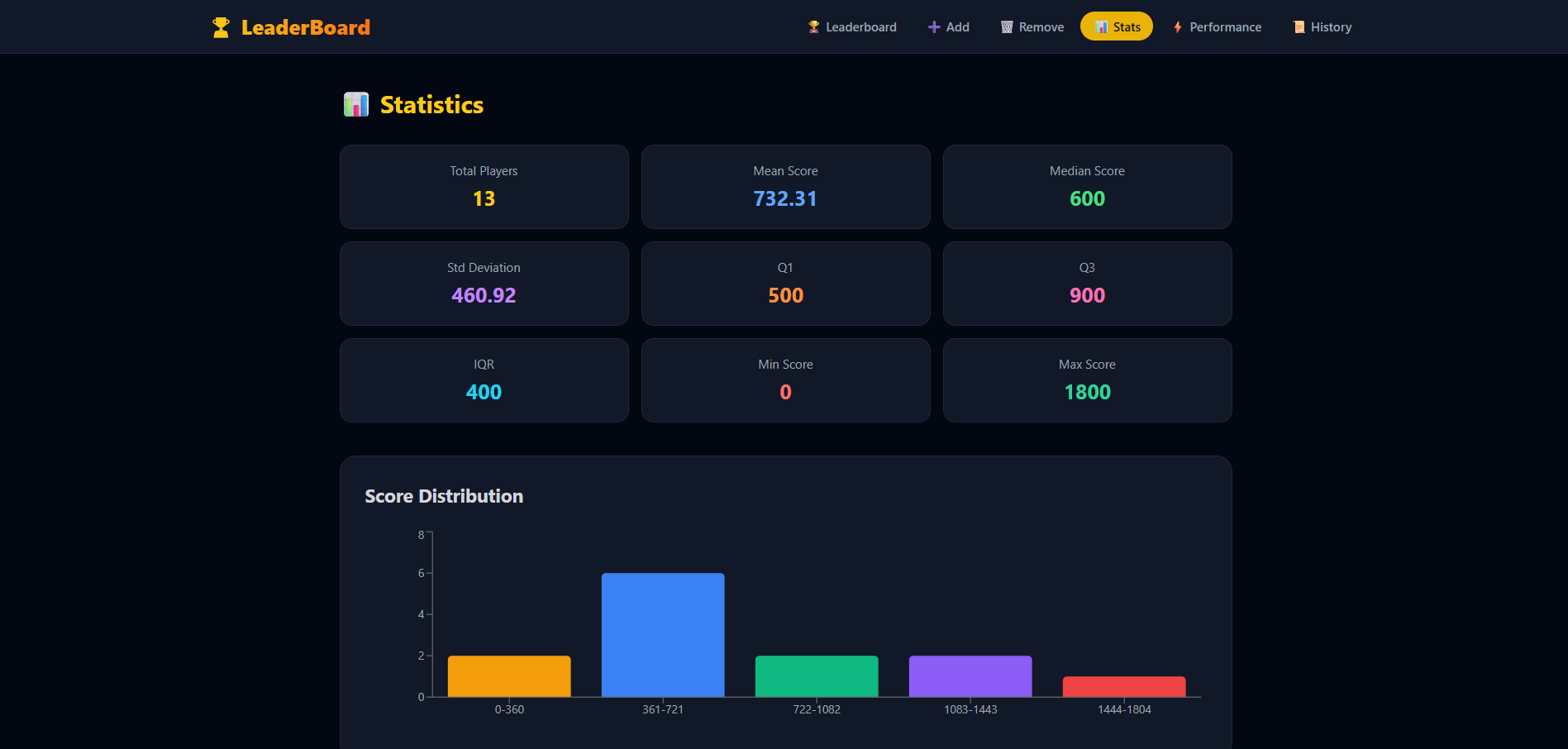 Advanced statistics with mean, median, std deviation, quartiles, and live score distribution chart.