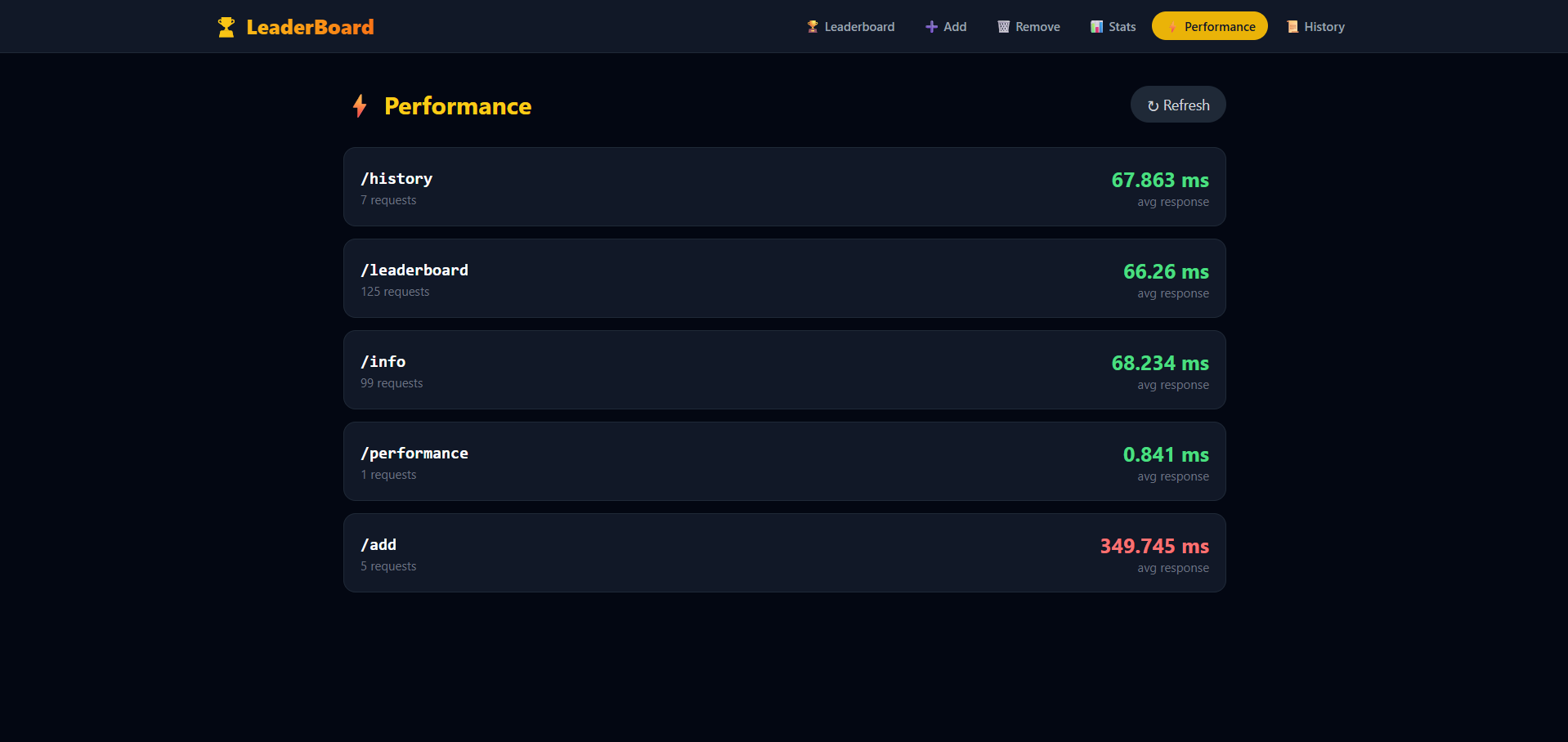 - Performance Tracking: Custom middleware that tracks average response time per endpoint in real-time