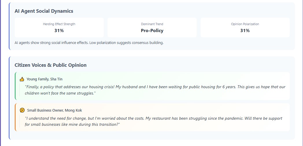 - Individual Decision Making: Each citizen AI agent evaluates policies based on personal characteristics