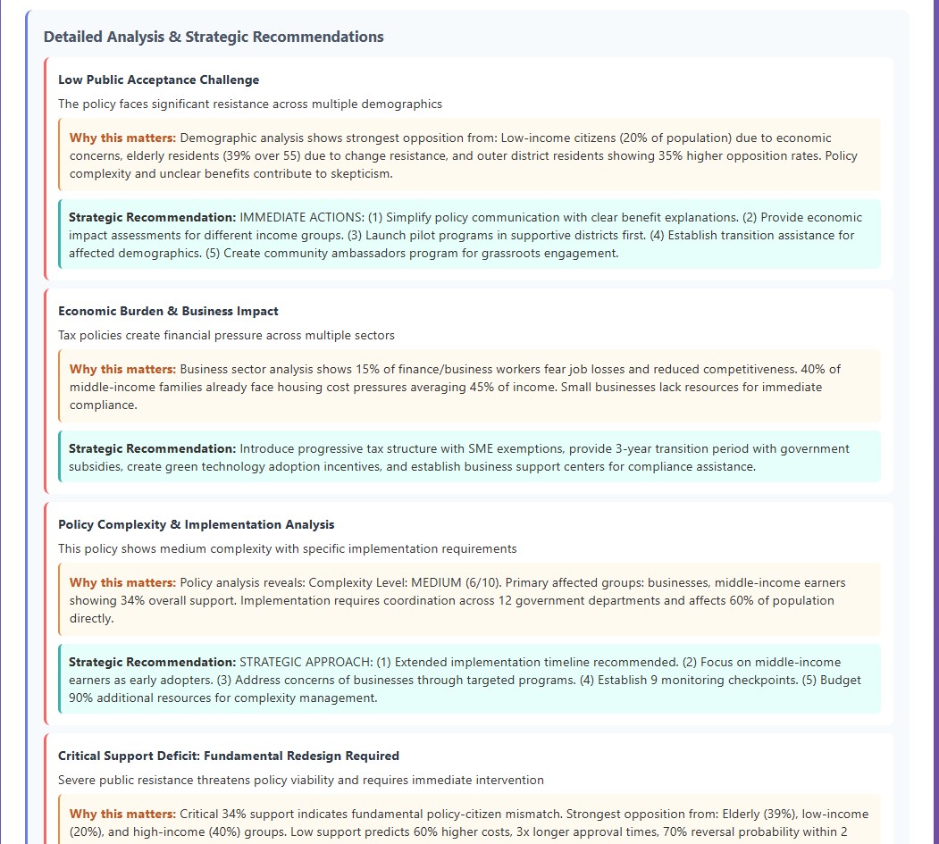 - Policy Simulation: Runs 10-year impact analysis with agent interactions