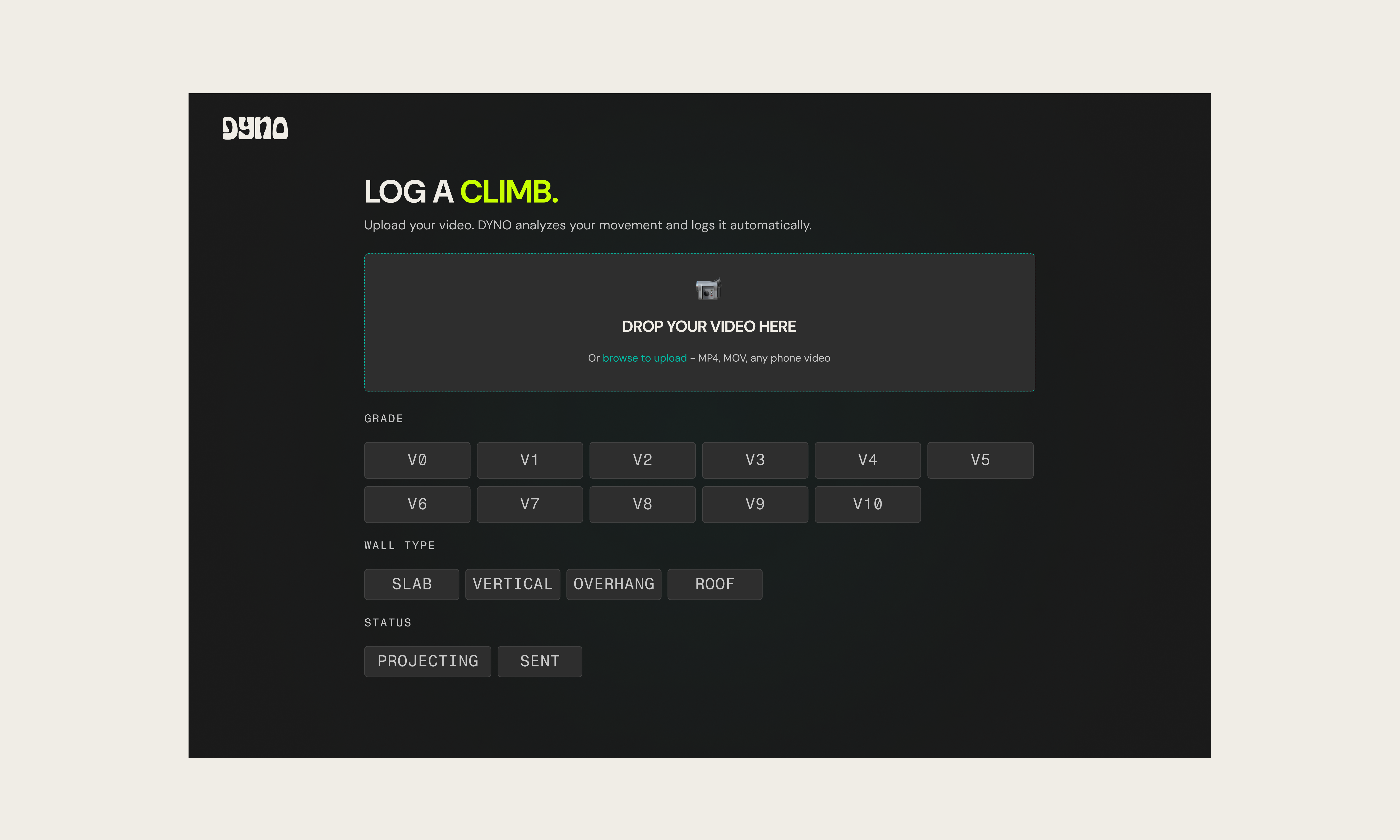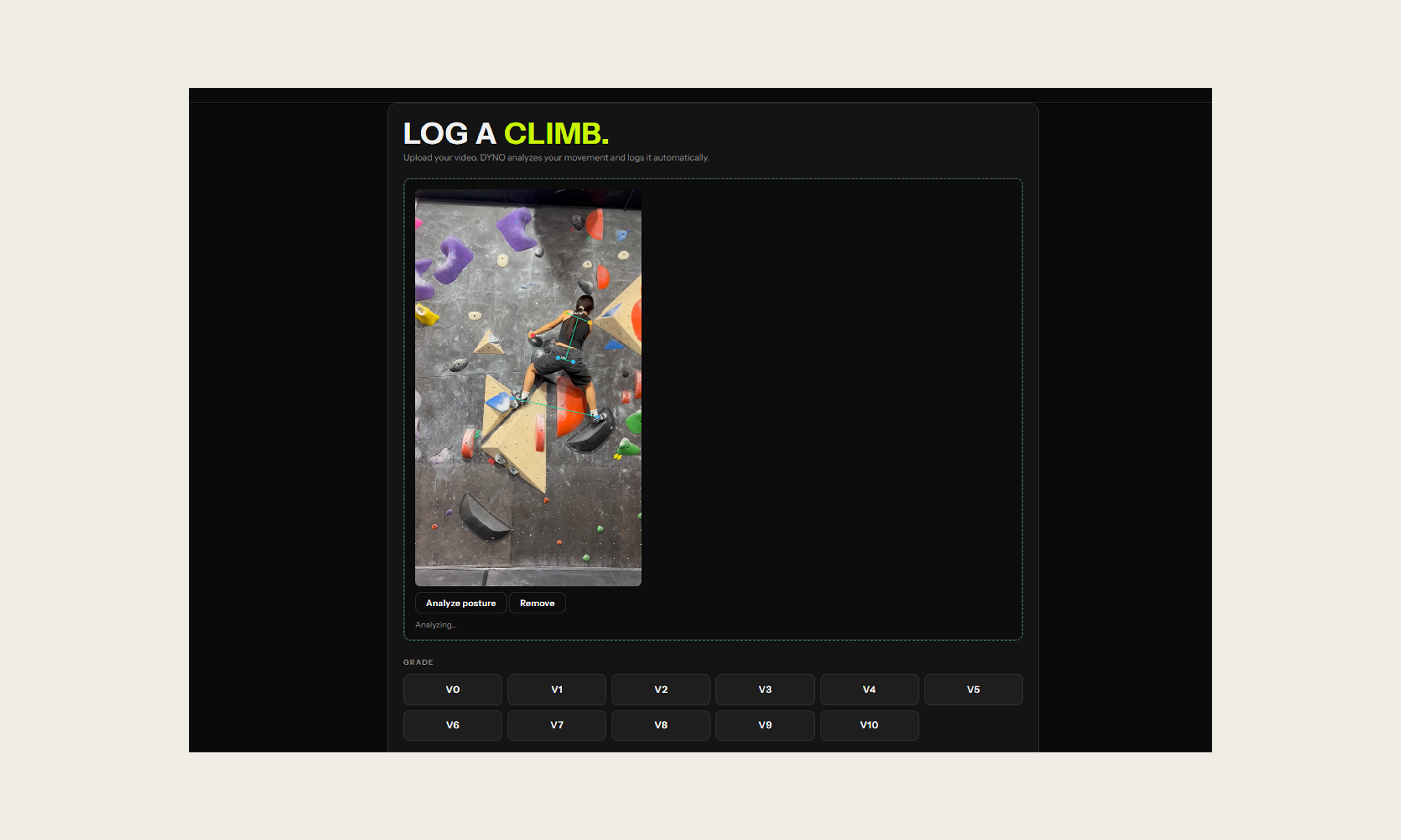 We wanted to build a tool that helps climbers see their progress clearly. DYNO was inspired by the idea that improvement becomes much more motivating when it’s visible. By combining climb tracking, video analysis, and predictive insights, we wanted to help beginners understand how they’re improving and what they should aim for next.
