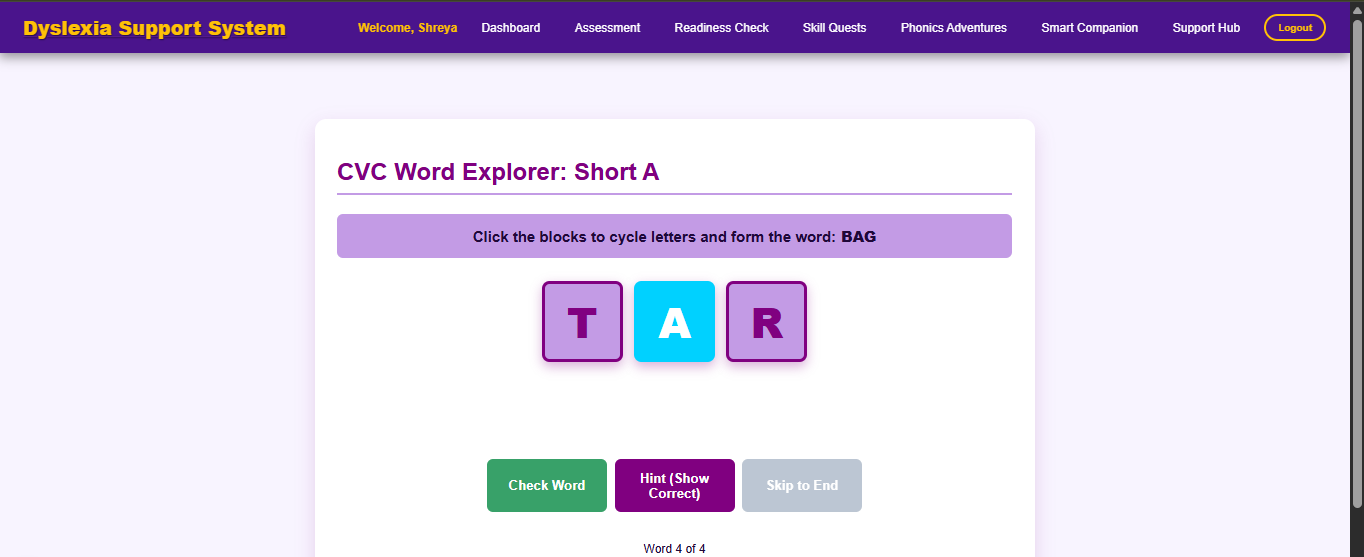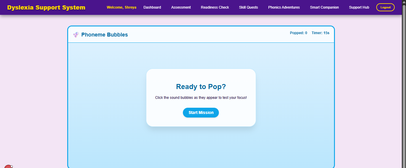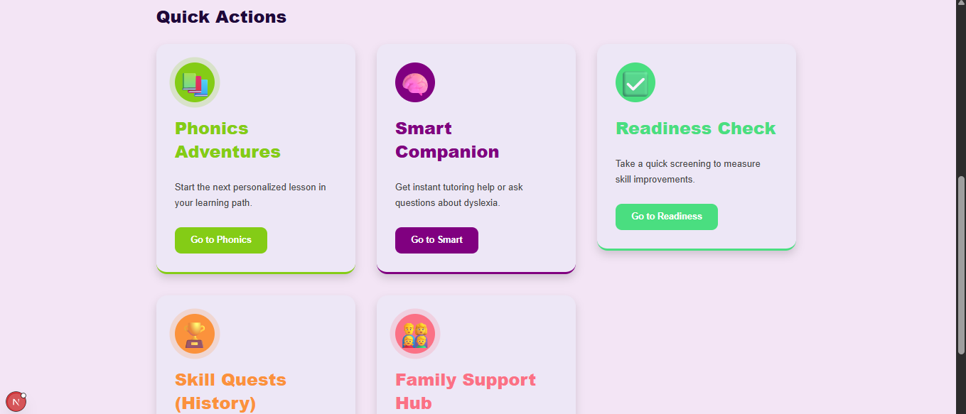 Advanced Analytics: I plan to implement more complex math for naming-speed assessments, using $Words\ Per\ Minute$ (WPM) tracking to show parents detailed fluency graphs.Multi-User Roles: I want to expand the (auth) module to include a "Teacher Portal," where an educator can monitor the progress of an entire classroom of students from one dashboard.Voice Integration: To further assist children with reading difficulties, I aim to integrate a text-to-speech engine that can read the "Skill-Quests" aloud, making the platform even more accessible.