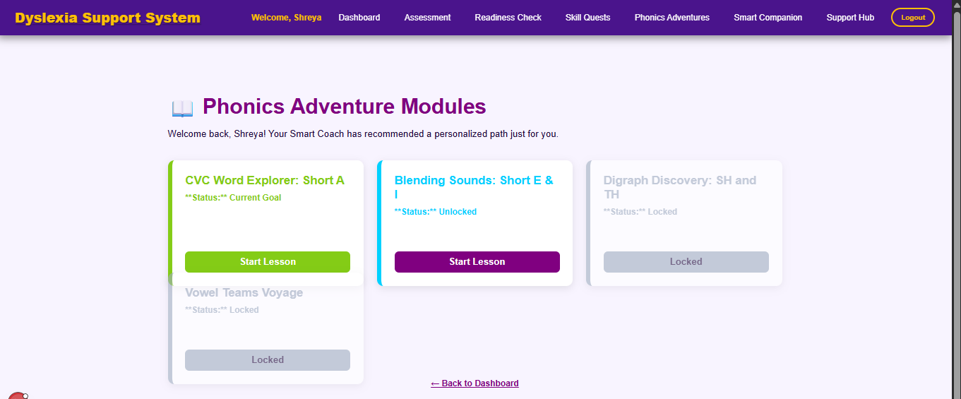 Advanced Analytics: I plan to implement more complex math for naming-speed assessments, using $Words\ Per\ Minute$ (WPM) tracking to show parents detailed fluency graphs.Multi-User Roles: I want to expand the (auth) module to include a "Teacher Portal," where an educator can monitor the progress of an entire classroom of students from one dashboard.Voice Integration: To further assist children with reading difficulties, I aim to integrate a text-to-speech engine that can read the "Skill-Quests" aloud, making the platform even more accessible.