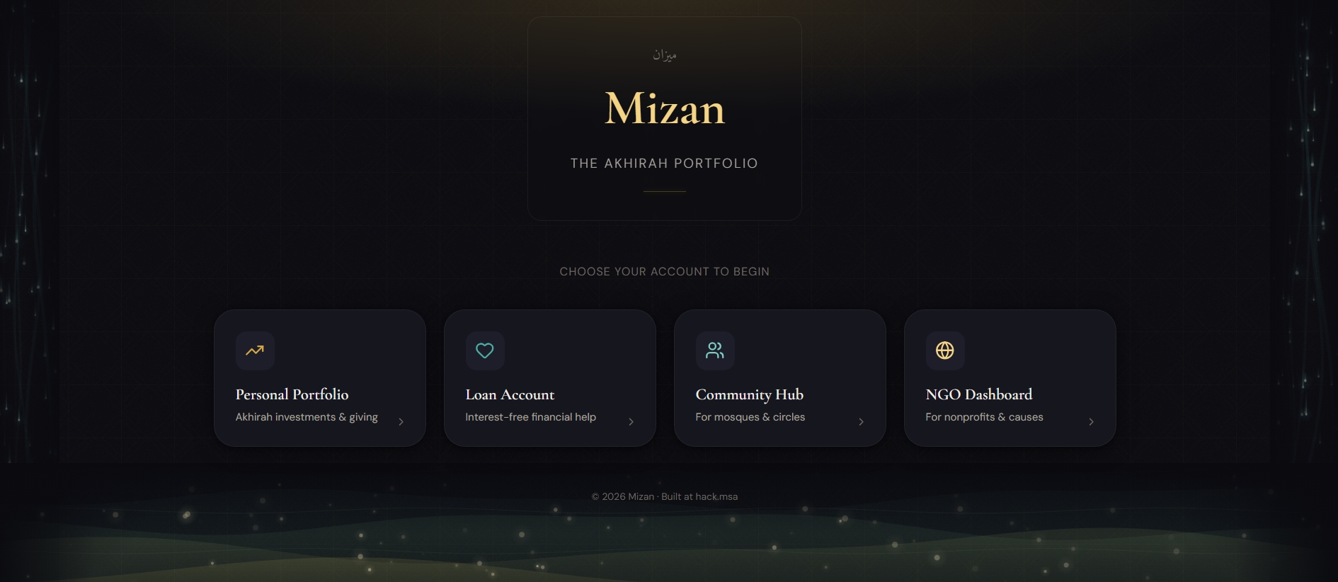 Mizan is an AI-powered Islamic finance platform that treats sadaqah, qard hassan, and sadaqah jariyah as portfolio instruments — with live positions, compounding cycles, and a 3D impact globe showing where every dollar has physically reached.