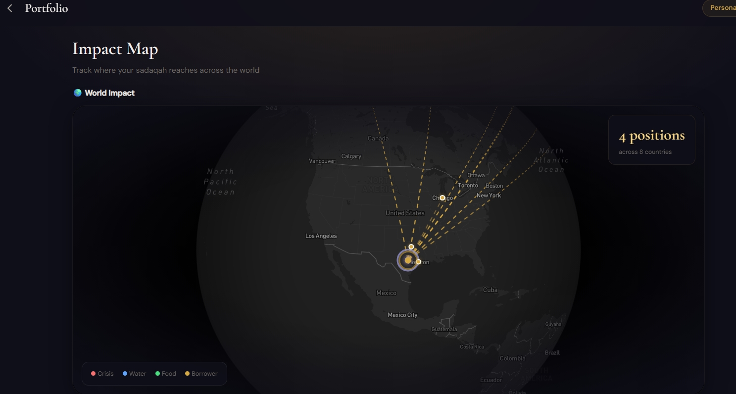 3D Mapbox Impact Globe. We use the Mapbox GL globe projection to render every active position as a geolocated node on a live rotating world, color-coded by cause (Crisis / Water / Food / Borrower) with animated paths from donor city to destination country. Users don't just see a number — they see their sadaqah physically reaching eight countries at once.