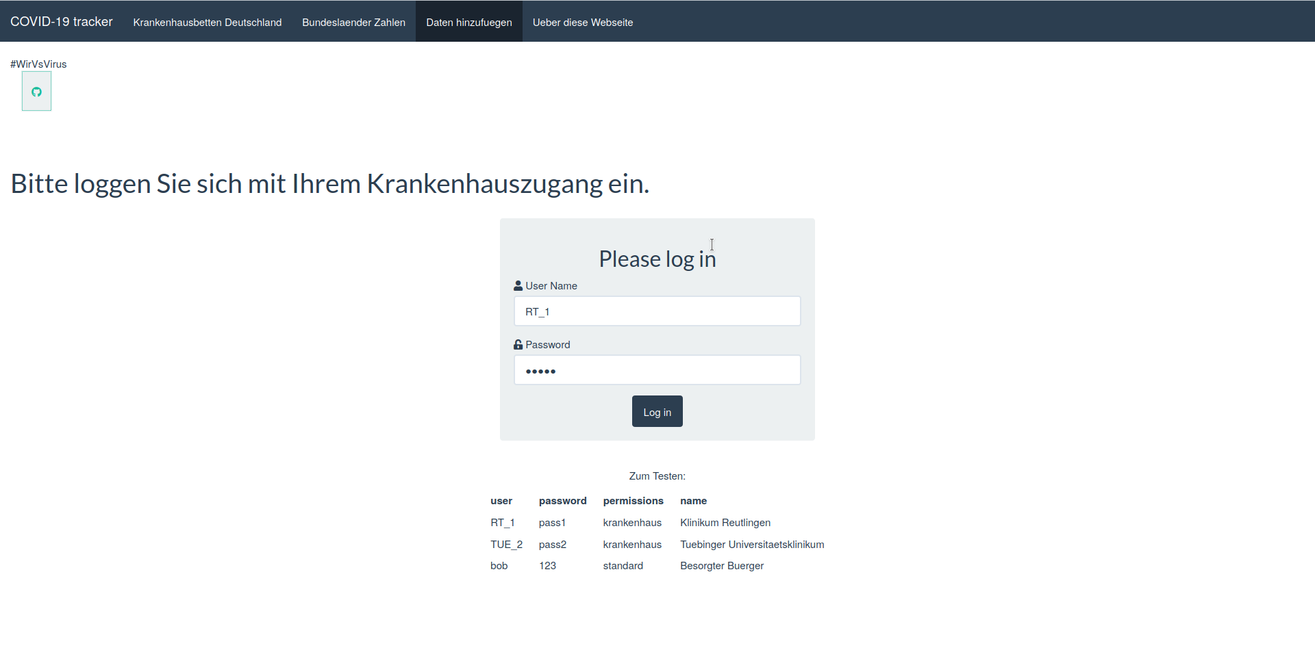 Login-Screen für z.B. Datenupload, hier bislang zwei Nutzergruppen: Bürger und Krankenhausmanagement