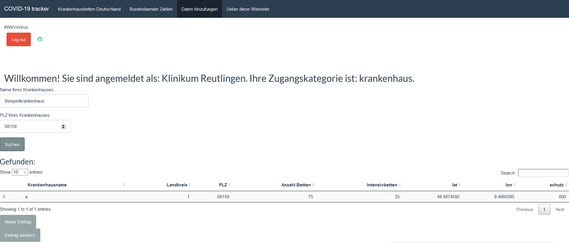 Wir konzentrieren uns auf die Funktionalität, dass Krankenhäuser oder andere Nutzer mit entsprechender Berechtigung Daten eingeben können. Denkbar wäre eine Nutzung, die zentral durch den Bund koordiniert wird. Insbesondere ist es hier besonders einfach in R entwickelte Vorhersagetools einzubinden und Trend Predictions live in der Karte zu simulieren. Ebenso ist eine Anbindung an bestehende Datenbanken und ein schnelles Deployment auf Servern möglich. Vor allem aber lassen sich schnell weitere Tools in das Framework einbinden, um die oben genannte Modularität für unvorhergesehene oder dringende Herausforderungen zu gewährleisten.