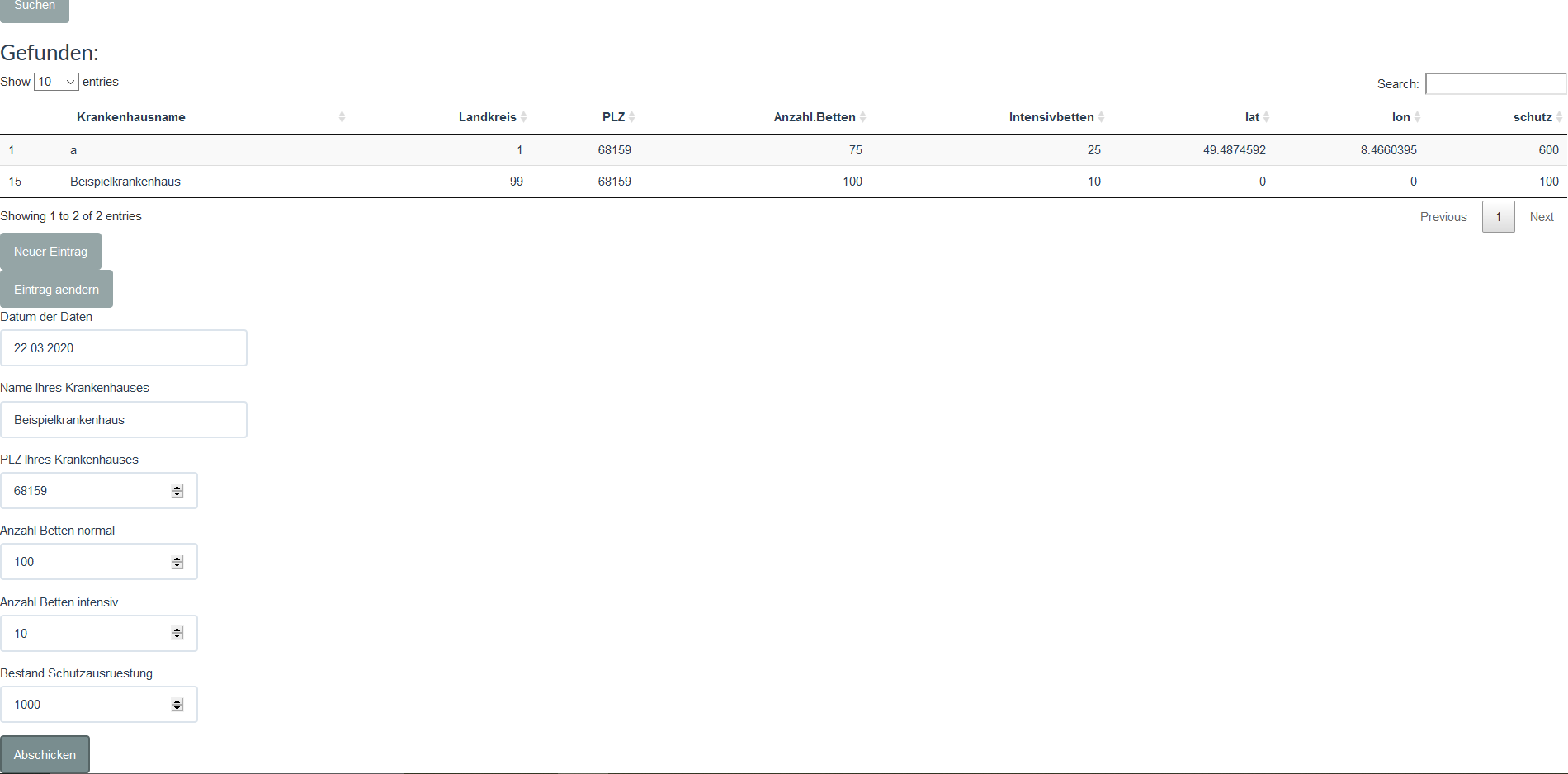 Hier werden nun vorhandene Einträge angezeigt (z.B. Krankenhaus "a")