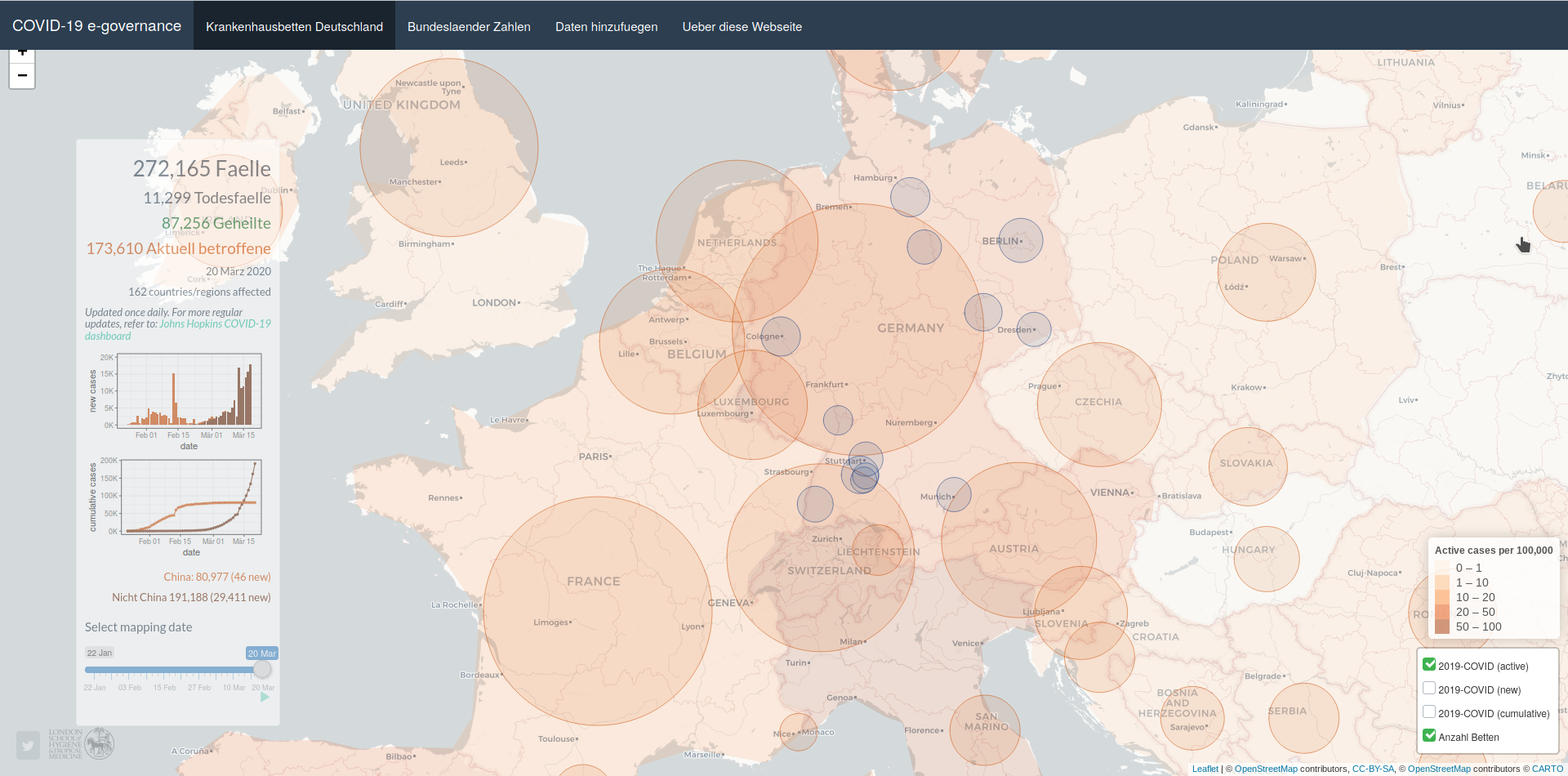 - diese interaktiv in einer Karte gegen die aktuelle Lage der Coronafälle zu visualisieren