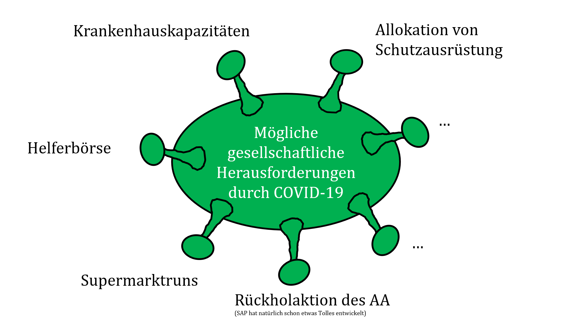 Krankenhäusern, Behörden oder anderen Gruppen wird dadurch ein Tool zu geben, welche Einrichtungen im Umkreis bezüglich freier Kapazitäten anzeigt um somit die Auslastung der Krankenhäuser effizienter gestalten zu können. Ebenso soll es somit erleichtert werden, Krisengebiete schnell auf der Karte sichtbar zu machen und durch entsprechende Erweiterungen mithilfe von Predictive Modelling zukünftige Kriesengebiete frühzeitig zu erkennen. Somit wird die rechtzeitige Planung entsprechender Massnahmen effektiver. Das Predictive Modelling kann auf den zusammengetragenen Daten (Zeitreihen zu lokalisierten Fällen und Kapazitäten), ist aber mangels Zeit noch nicht implementiert.