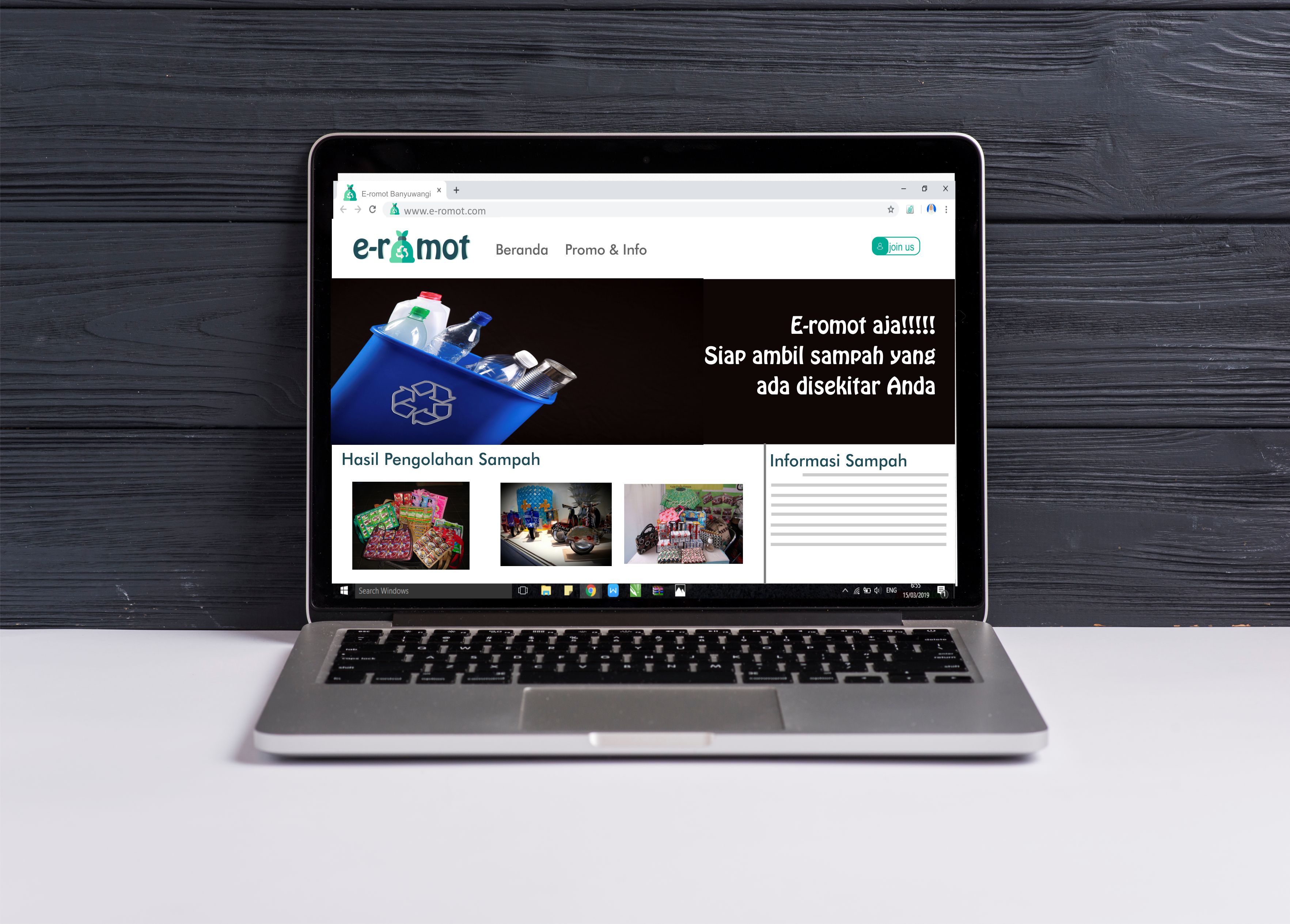 Sampah dikumpulkan di kantong dan tong yang sudah kami sediakan, jika sudah penuh Anda dapat hubungi dan mengkonfirmasi kami melalui website dan aplikasi e-romot. Setelah itu, kami akan memosting produk -produk unggulan ini dari sampah dalam e-romot. tidak hanya itu, user juga dapat memposting produk dari sampah hasil karya mereka ke aplikasi kami. Selain itu ada fitur khusus berupa galeri hasil kerajinan dari sampah dimana pengunjung dapat membelinya