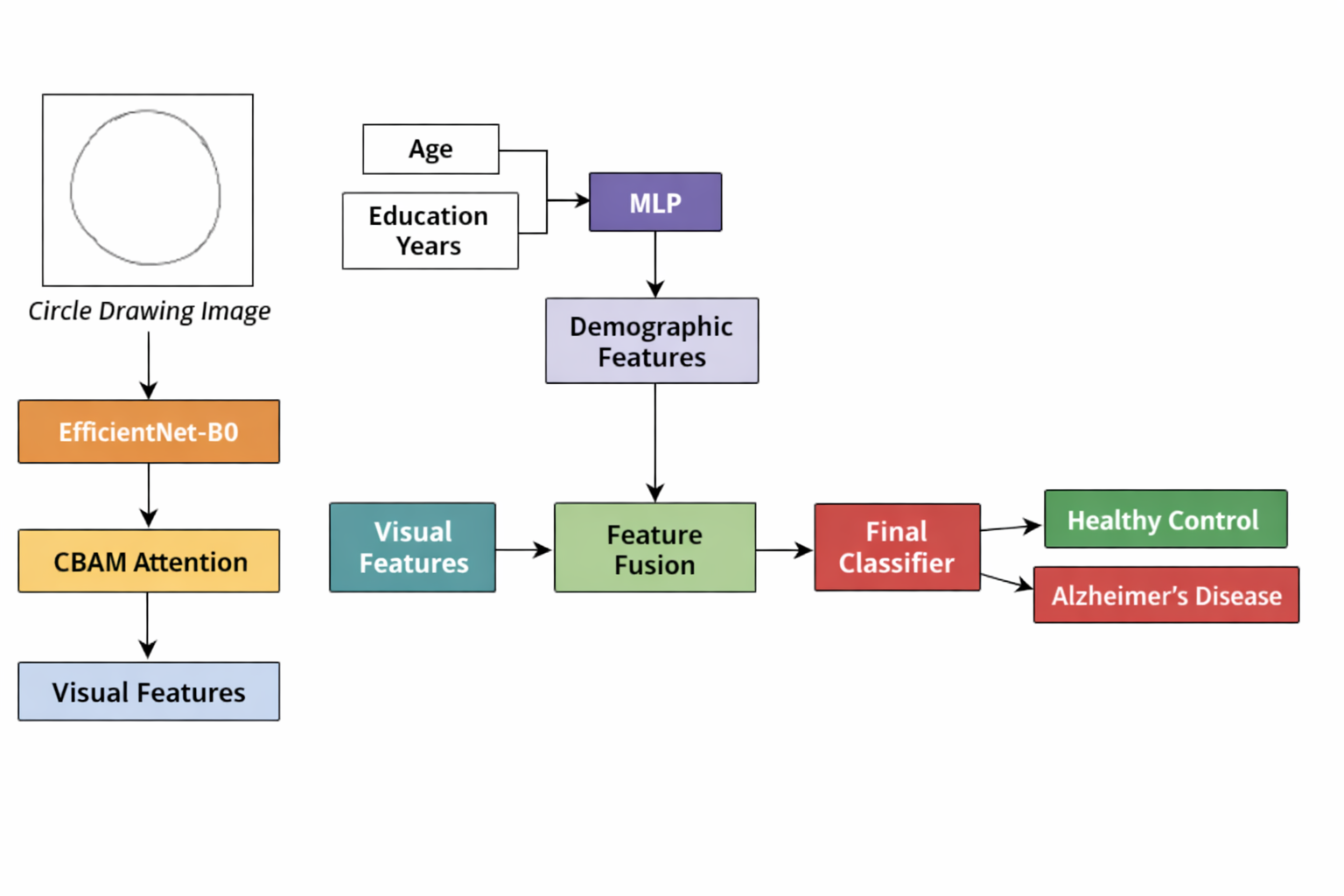 The visual data was processed using an EfficientNet-based convolutional neural network enhanced with an attention mechanism to capture relevant drawing patterns and increase interpretability. Demographic features such as age and years of education were encoded through a separate network and fused with the visual embeddings.
