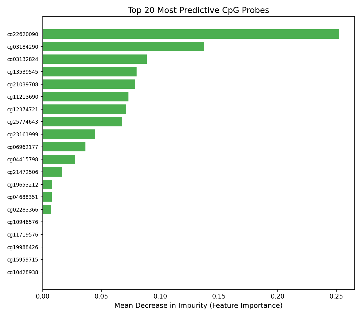 - Interpretability: Feature importance outputs identify which CpG sites drive predictions, connecting model decisions back to known cancer biology.