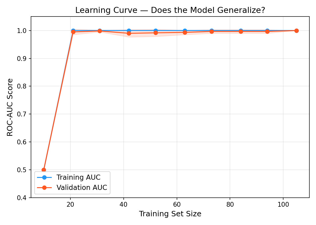 - Evaluation: 5-fold stratified cross-validation, ROC/AUC curves, confusion matrix, learning curves, and feature importance plots, all in a dedicated evaluation module.