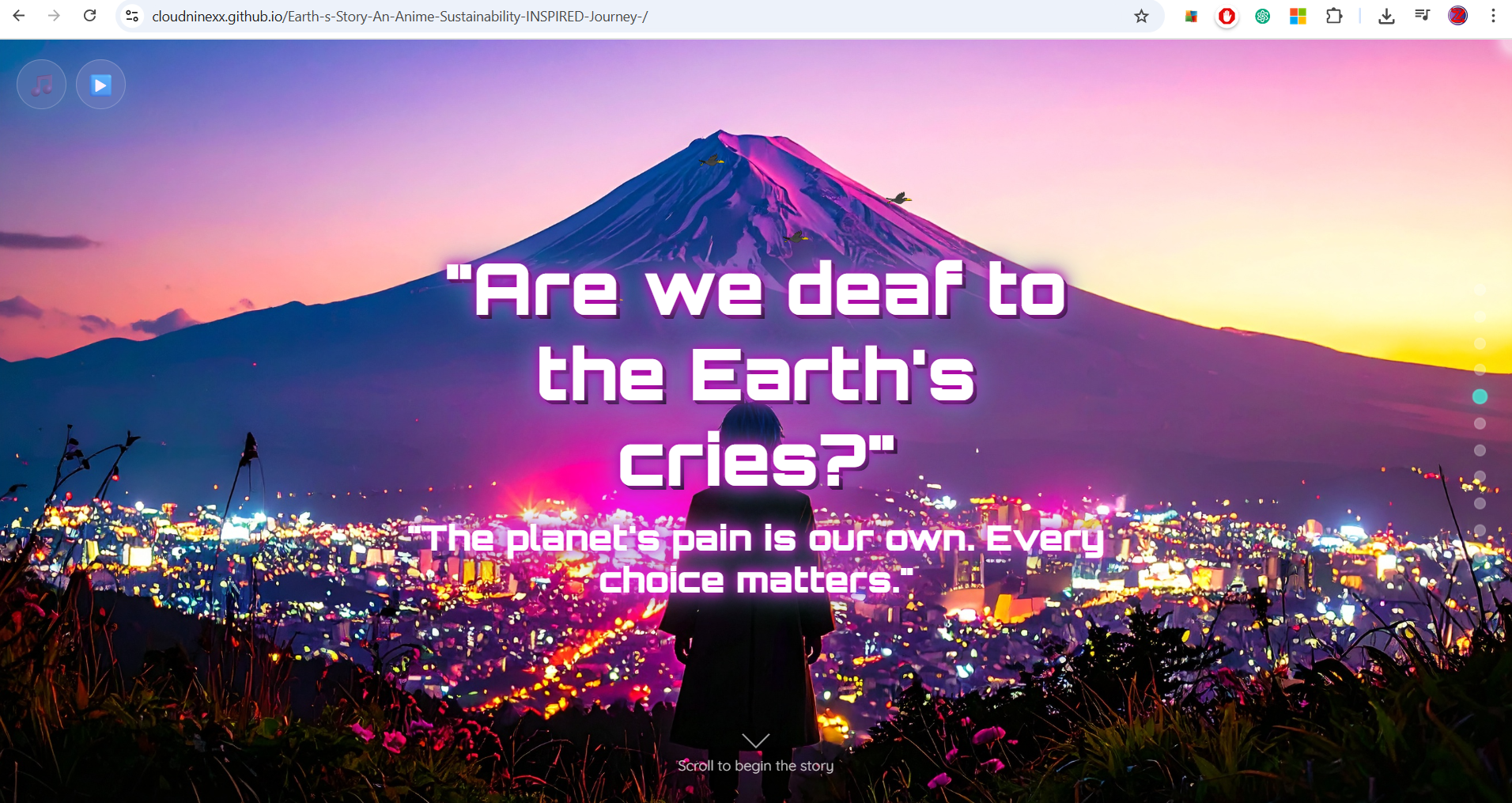 The project is a full-screen, vertical-scrolling web experience that tells a story about Earth's past, present, and sustainable future. As the user scrolls, they are guided through different chapters of the narrative, each with its own unique visual style and ambient audio. The experience features enchanting parallax effects, a custom cursor, music and a narrator, transforming a simple scroll into a powerful and immersive journey.