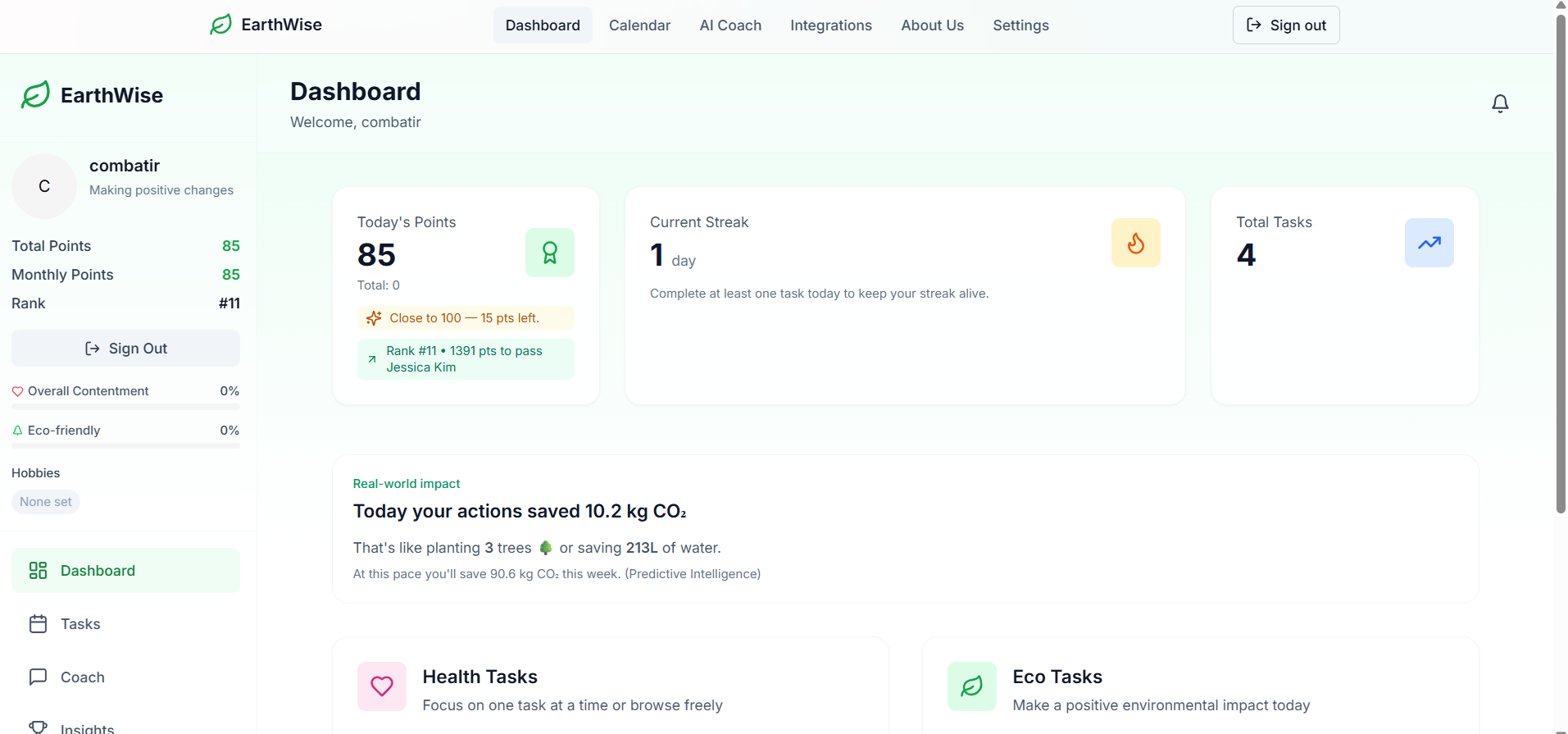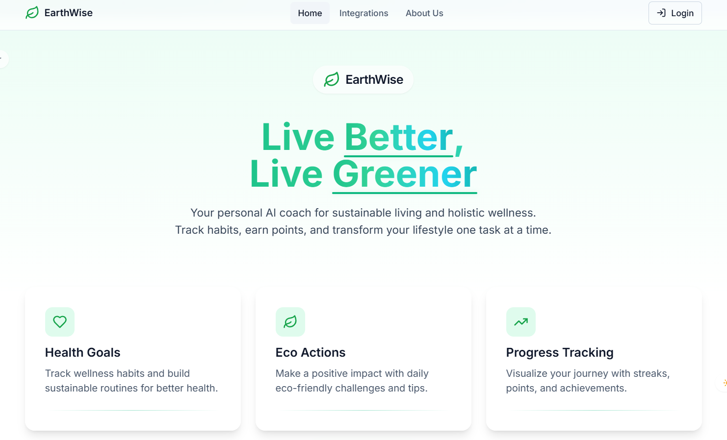 EarthWise is an AI-powered sustainability and wellness coach that tailors eco-friendly habits based on your actual purchases and lifestyle. By linking your shopping behaviour, we turn everyday actions into meaningful impact.