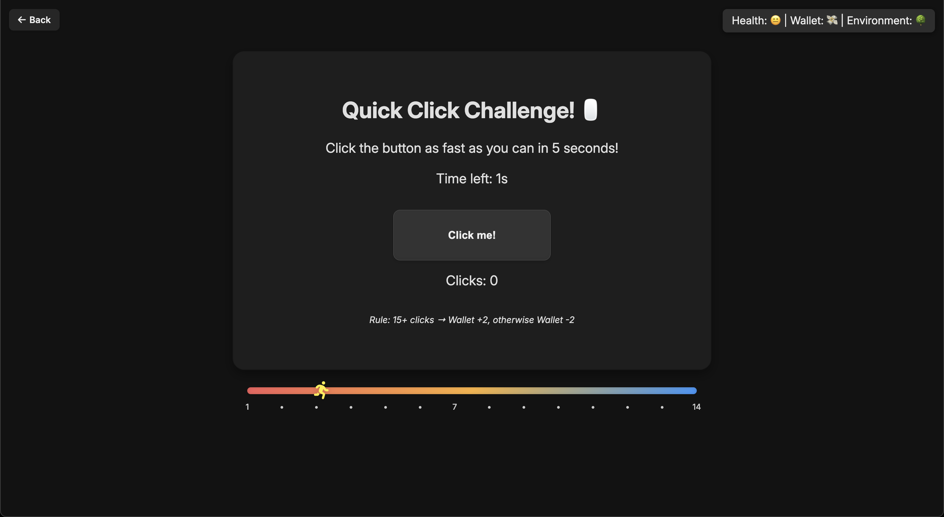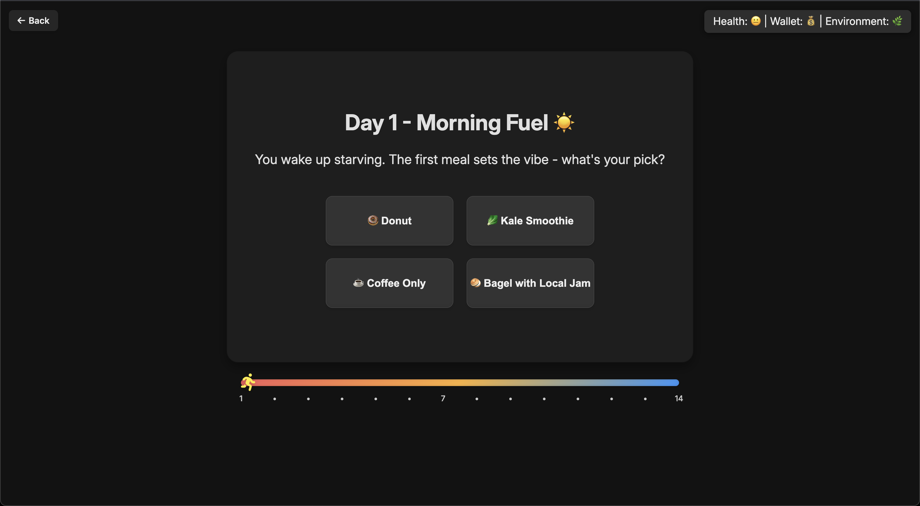 We wanted to create a fun, story-driven game that players can enjoy in quick sessions while still having meaningful choices. The idea came from observing how everyday food choices like breakfast, lunch and dinner can subtly impact health, wallet and the environment. We wanted to gamify that experience in a playful and educational way to let users see the consequences of their decisions over a 14-day in-game journey.