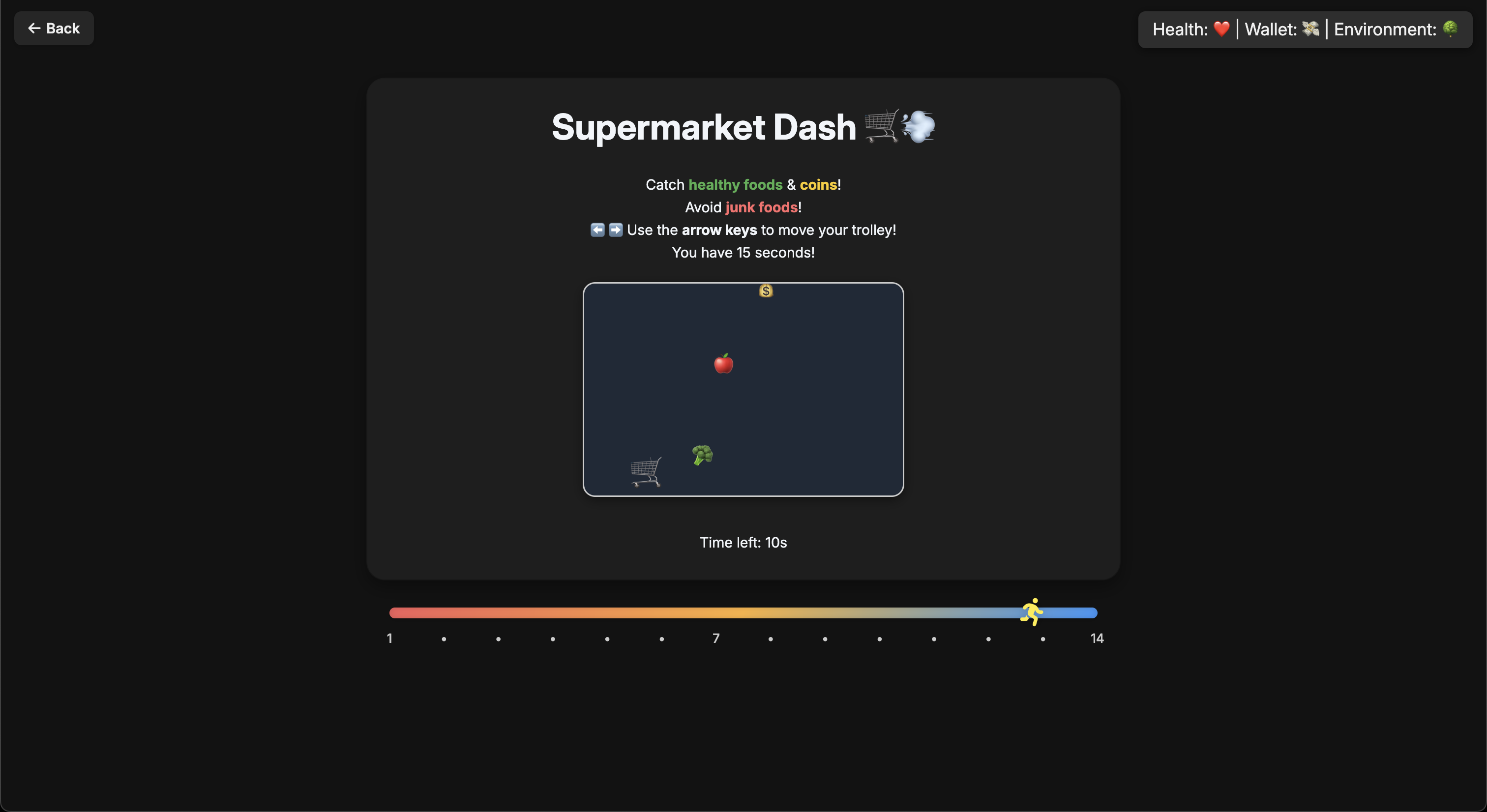 Eat For Tomorrow is a 14-day interactive story game where each day presents players with food choices. Every decision affects three stats: health, wallet and the environment. At the end of 14 days, players reach different endings depending on their cumulative choices. The game also includes mini-games like quick clicks, memory challenges, eco-plate sorting and supermarket dash, each designed to reinforce the impact of smart eating in a fun way.