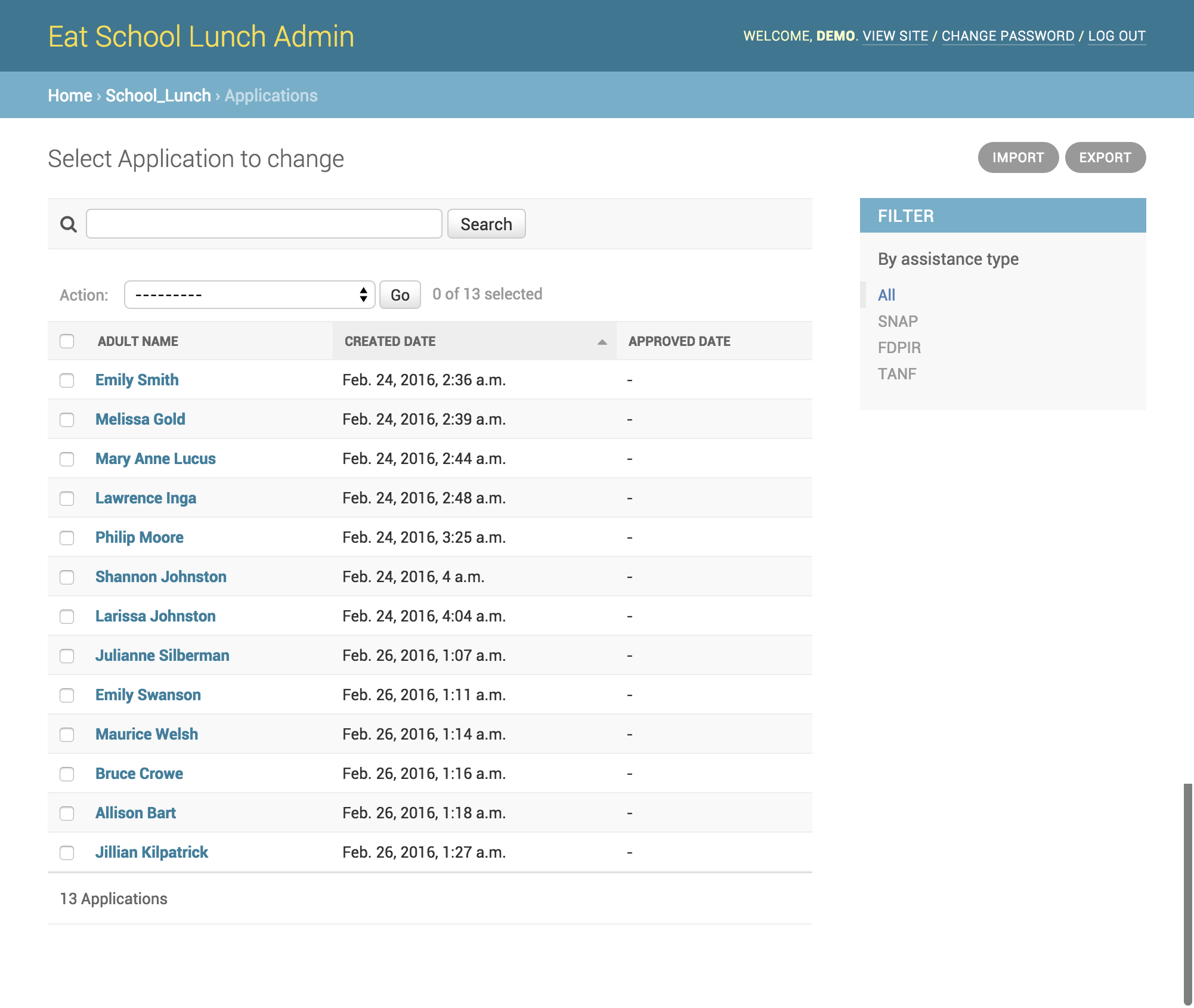 Admin Interface & CSV Export - Another aspect where we can leverage technology is in the admin interface for managing the applications coming in as well as exporting them into other systems. Django has a wonderful admin interface out of the box and with a few customizations we are able to allow admin users to easily search through applications by any number of fields like signing adult name, date, application id or child name as well as edit / mark as approved each application as it comes through. And once they're done processing the data they can export it in any of a number of formats including CSV, XLS and JSON (all of this can be seen in our demo video or on the live site).
