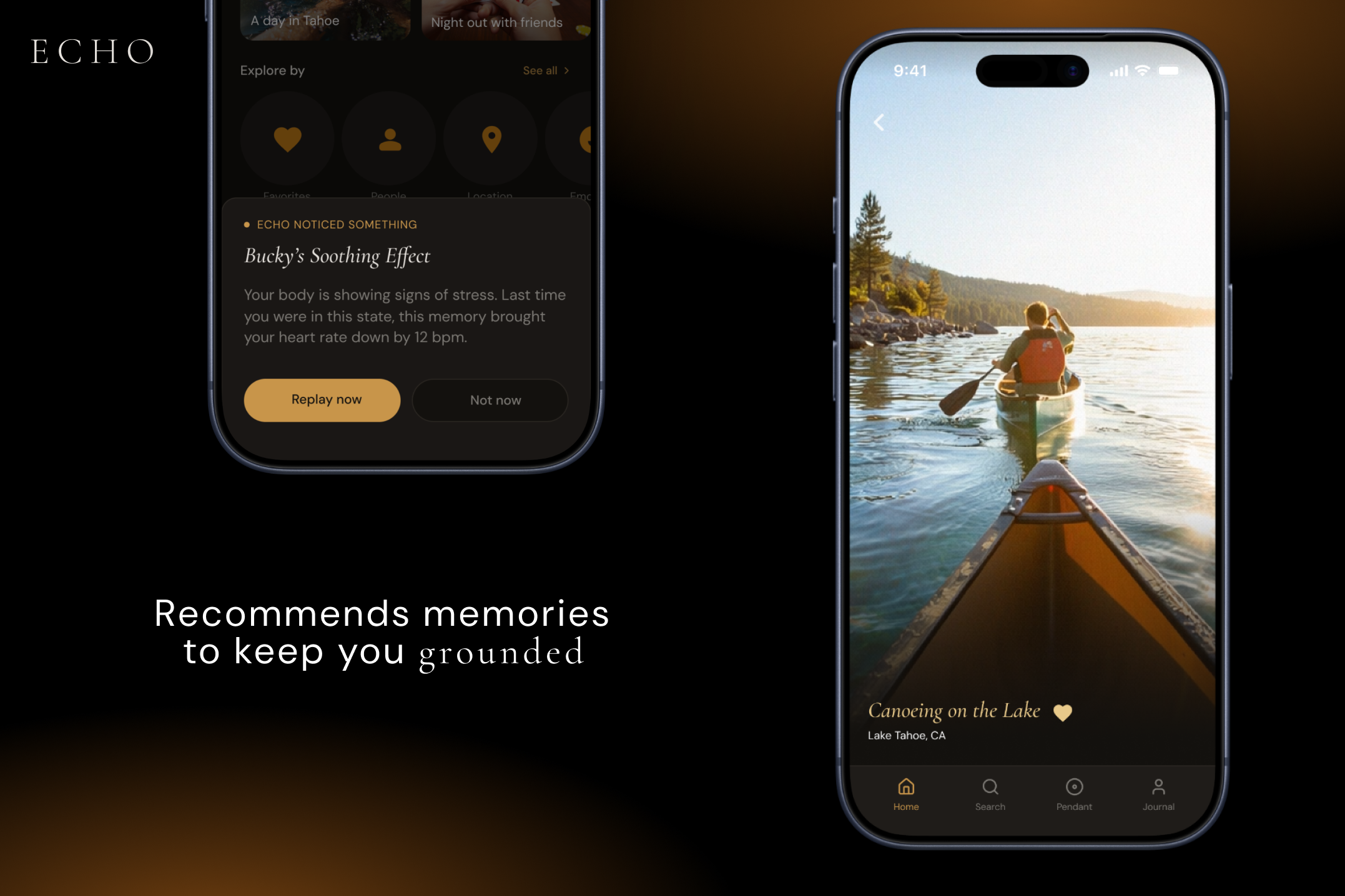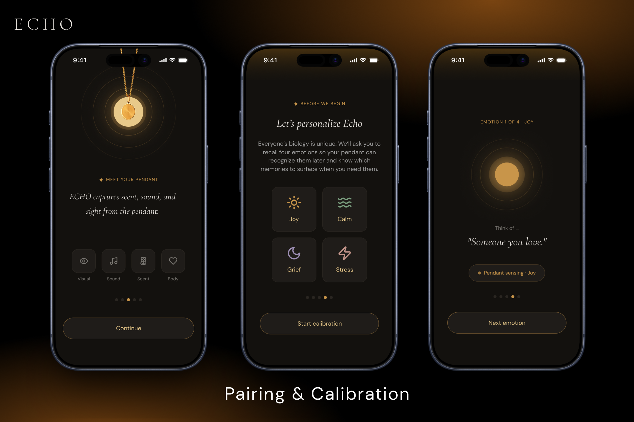 ECHO is a wearable pendant and mobile app that captures the full sensory experience of a moment including scent, sound, and visuals, and lets you return to the moment. During onboarding, the pendant learns what different emotional states feel like in your body. From that point on, it can notice when those states return and surface a memory that has helped before.