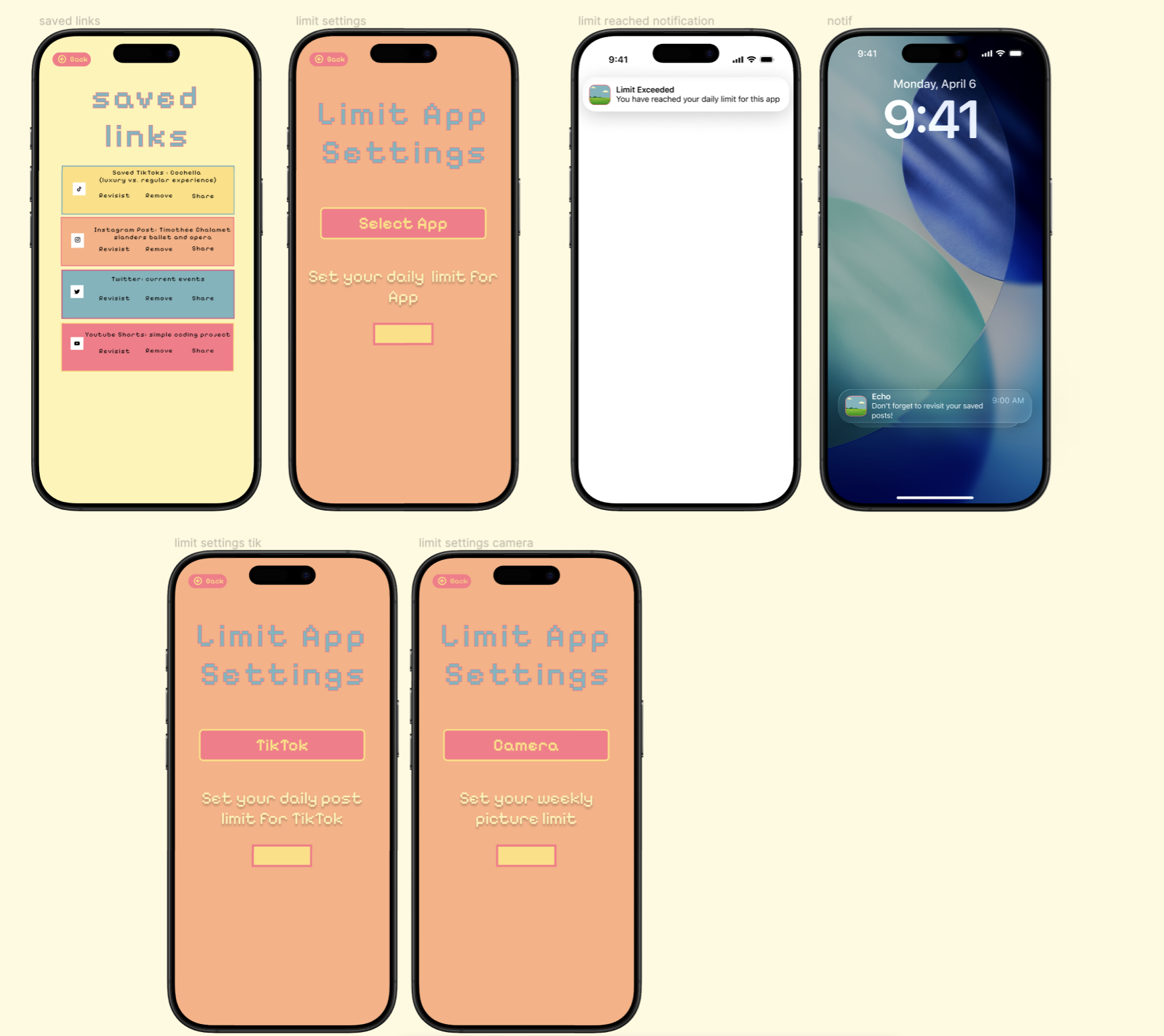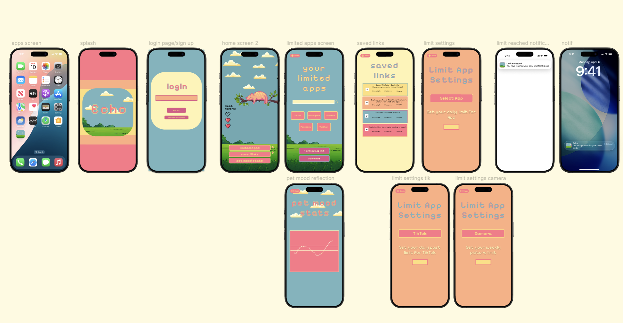 We designed Echo in Figma, focusing on core user flows, limited feed interaction, saving posts, reflection moments, and a companion system that responds to user behavior. We prioritized simplicity and clarity to ensure the concept remained understandable and focused.