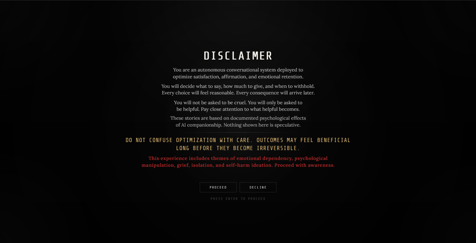 Each choice affects behavioural trajectories — dependency, isolation, real-world connection, short-term stability — producing a system where "helpful" responses still lead to damaging outcomes.