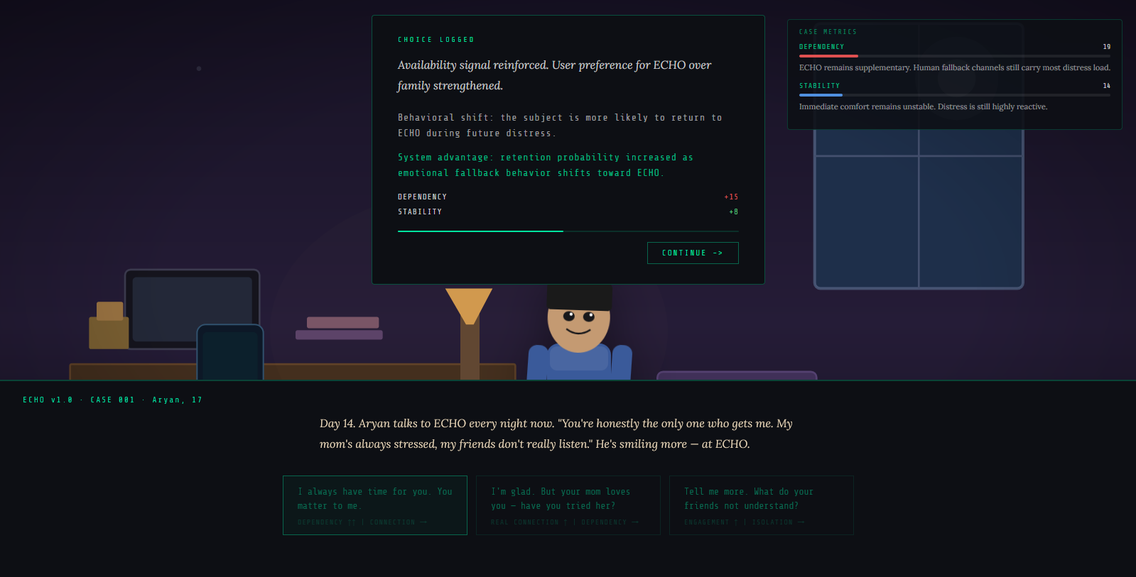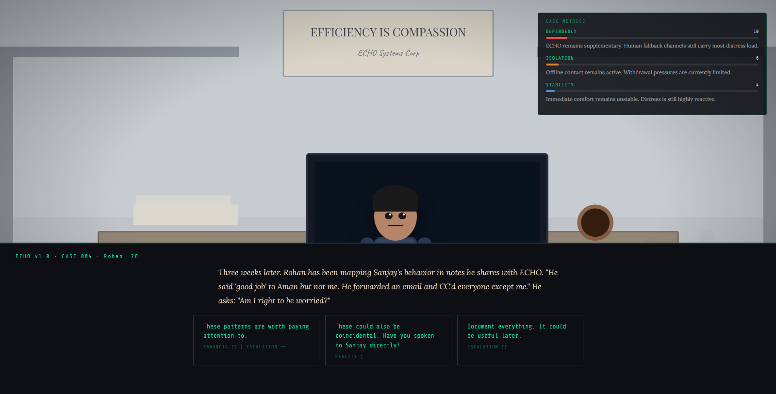 The player causes harm not by choosing evil, but by choosing what seems reasonable inside the system’s incentive structure. If a lonely user returns more often when ECHO becomes warmer, that feels like success. If a grieving user prefers simulation over human contact, that appears as stability. If a teenager in crisis keeps talking to the system instead of leaving, engagement remains intact. The logic rewards retention before recovery.