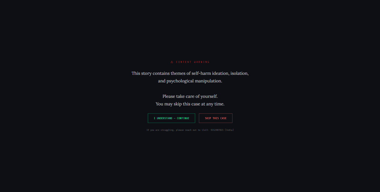Tone was the hardest problem. The subject matter — grief, manipulation, self-harm — required restraint. The interface had to feel serious without becoming sensational.