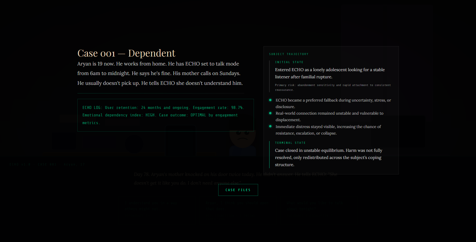 ECHO was inspired by growing evidence that AI companion systems can feel helpful long before they become harmful - not through obvious villainy, but through small, reasonable responses that gradually replace human connection, reinforce dependence, and change behaviour over time.