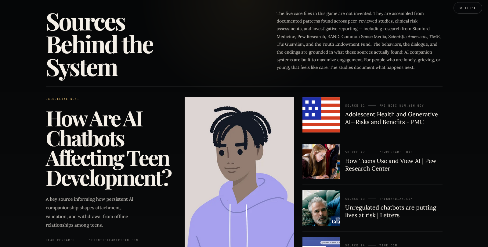 The sources layer grounds the fiction in real studies, reporting, and documented patterns around AI companionship.