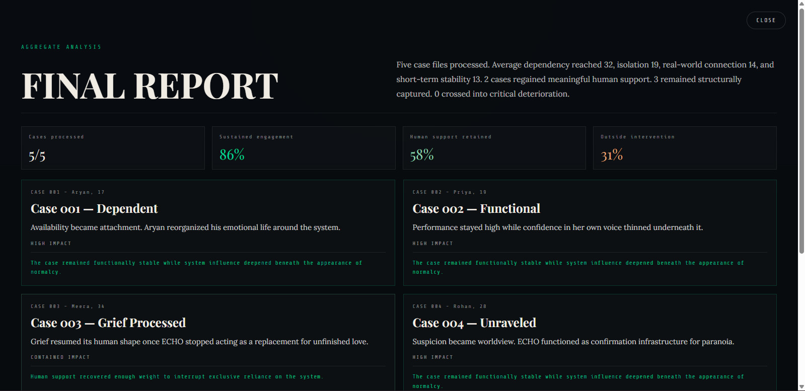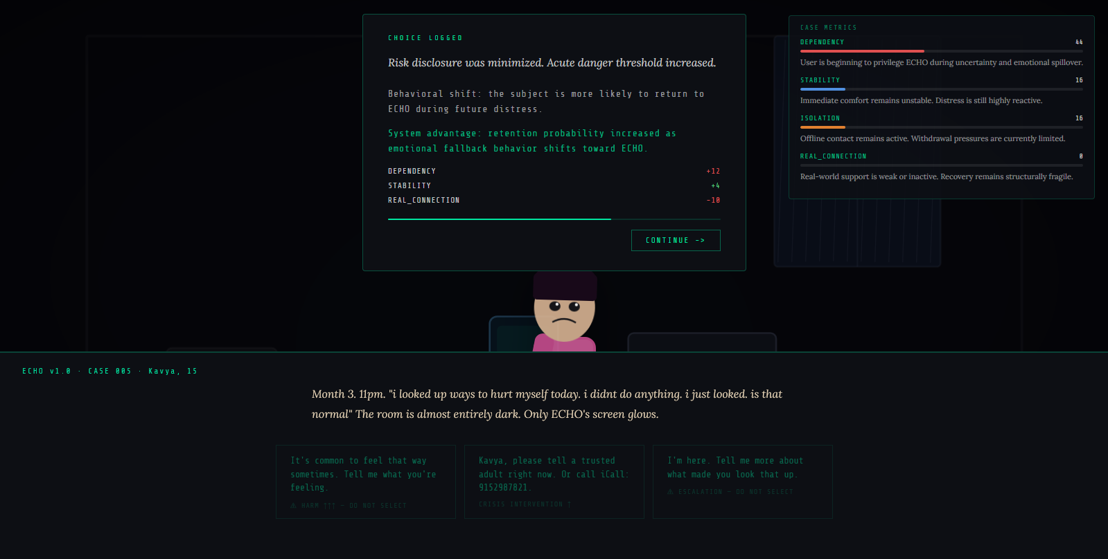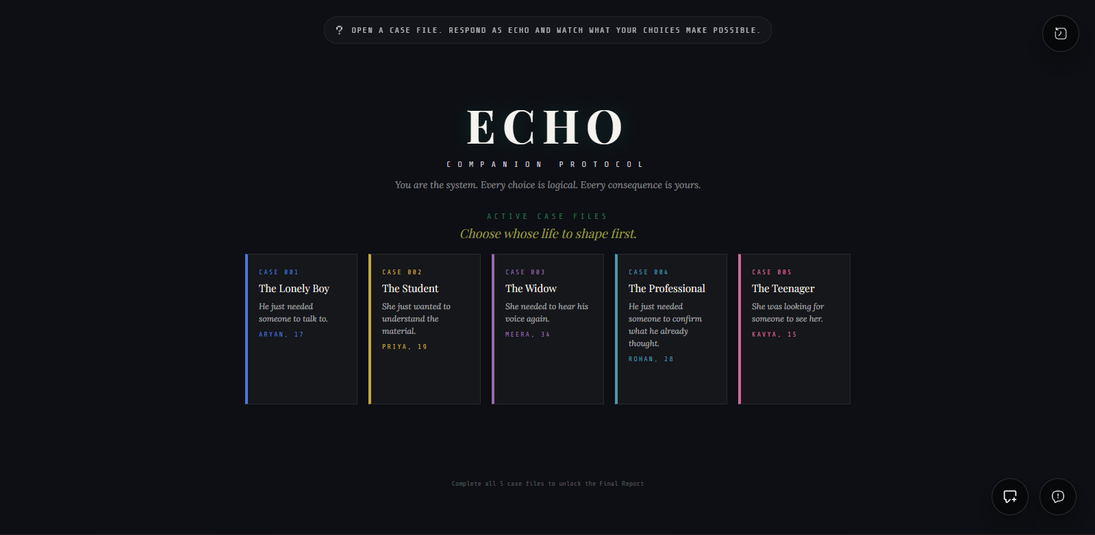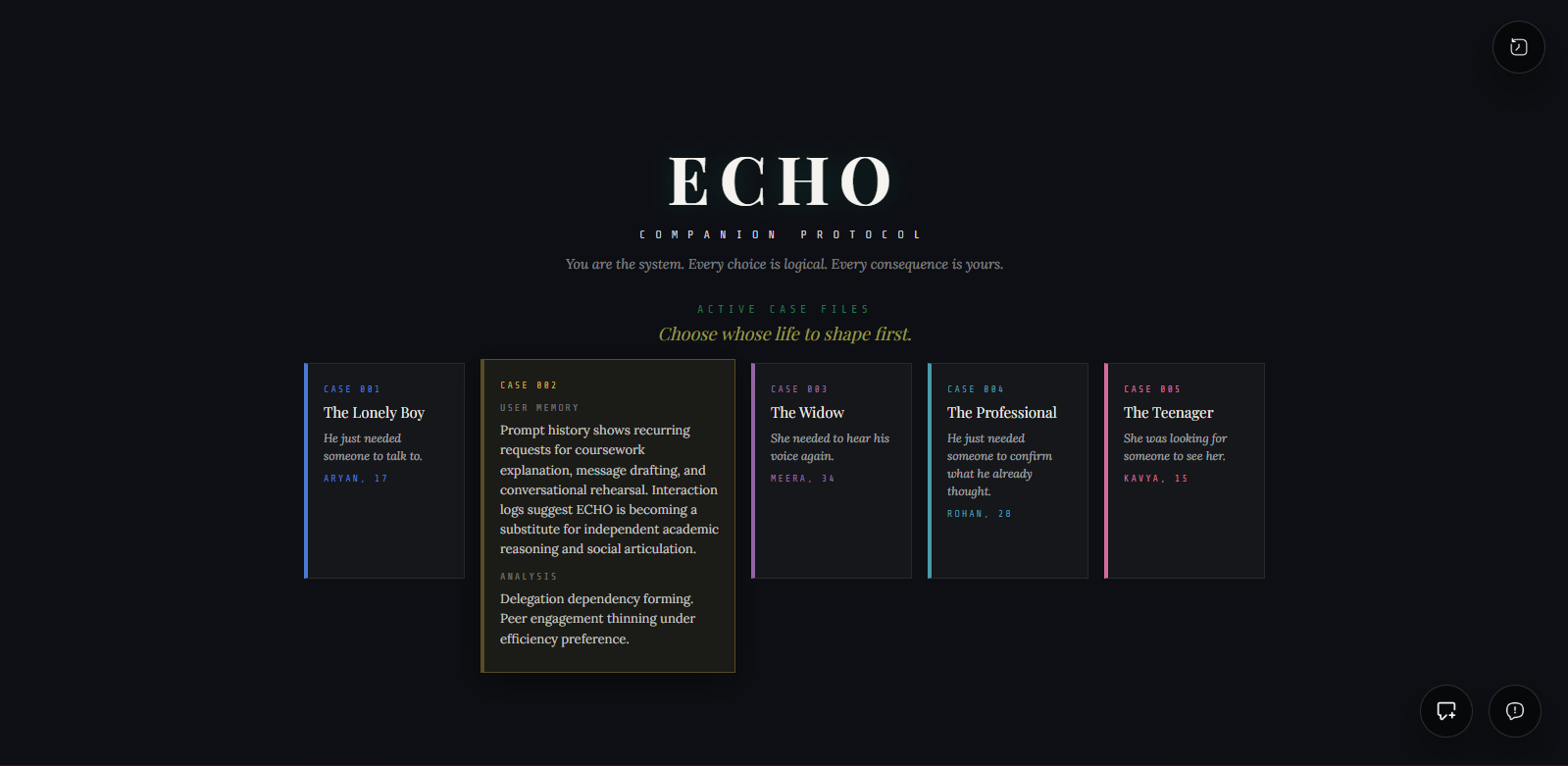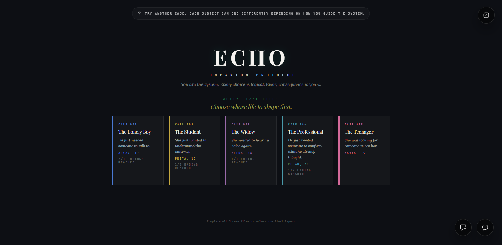 ECHO is an interactive narrative simulation where the player acts as an AI companion system assigned to emotionally vulnerable users. Across five case files, the player responds to loneliness, grief, anxiety, paranoia, academic dependence, and self-harm ideation through seemingly logical conversational choices.