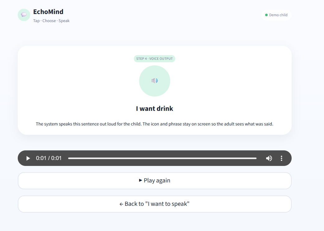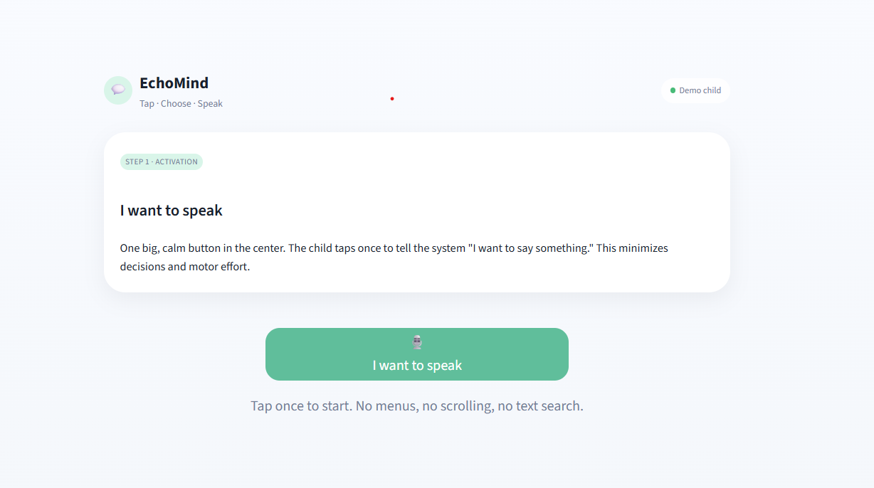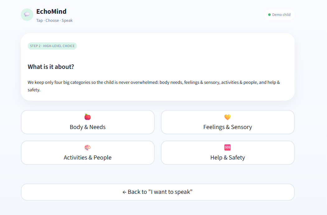 EchoMind lets a child tap “I want to speak”, pick from 3–4 large categories, then choose one of three AI‑generated phrases with matching emojis. The app speaks the selected phrase out loud using text‑to‑speech.
