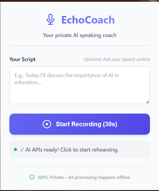 - Get personalized coaching tips tailored to their speech performance All processing happens offline using Chrome's Gemini Nano AI, protecting user privacy with no data leaving the device.