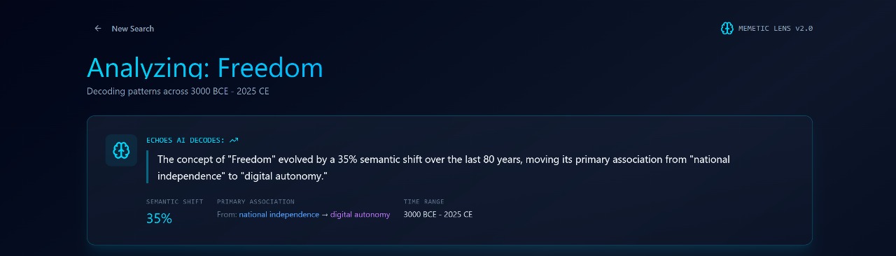 What it does Echoes is an AI-powered interactive platform that visualizes the evolution of human thought. It takes a concept word or symbol and instantly shows two types of cultural evolution Memetic Evolution Words It displays an Animated Constellation Graph showing how a concept's meaning shifts over decades e.g. "Freedom" moves from national independence to digital privacy. Pattern Rebirth Symbols It presents a Holographic Lens that allows users to overlay ancient geometric patterns Pyramids and spirals onto modern structures or design grids UI layouts highlighting the recurring design logic. The interface is styled as a "Historical Resonance" archive making the decoding process a visual and intellectual discovery.