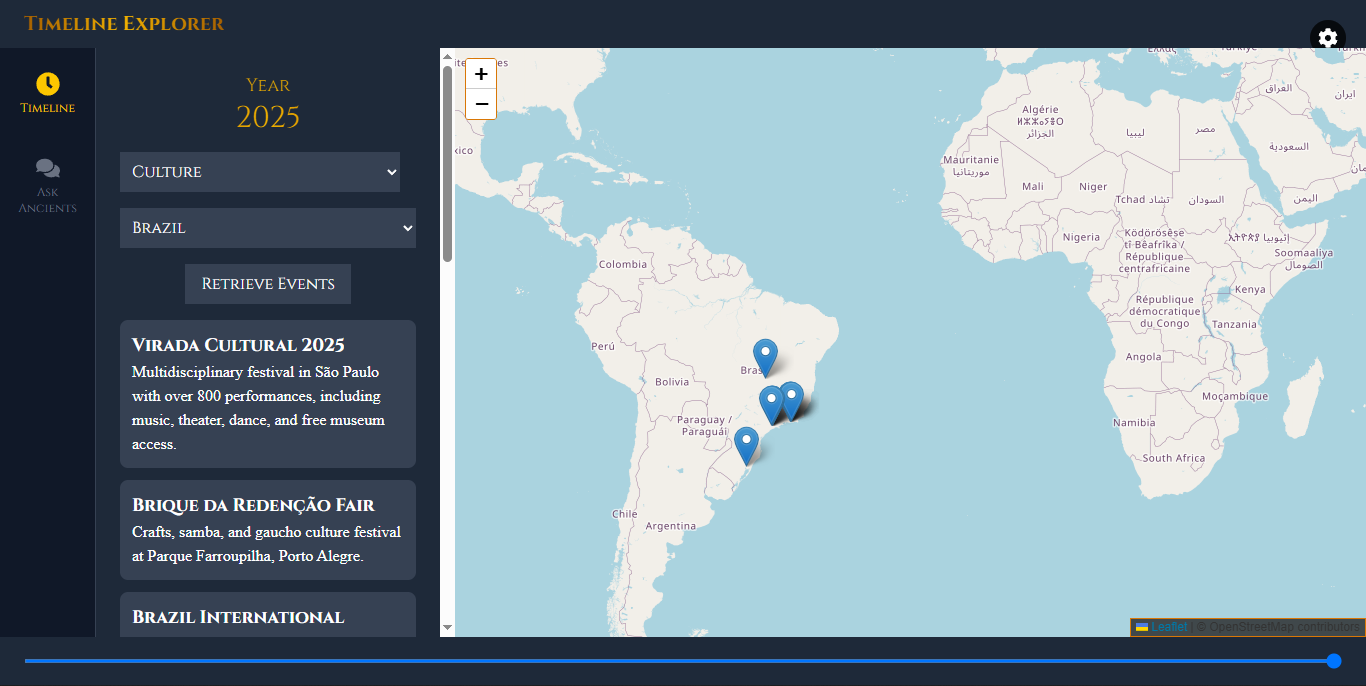 Timeline Explorer: Filter by year, topic, and country;