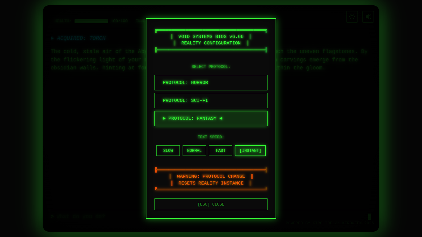 We wanted to build a game engine where the story isn't a script, but a conversation. A world that thinks, reacts, and punishes your mistakes in real-time. And most importantly, we wanted to prove that with the right architecture, a single codebase could power infinite genres—from Gothic Horror to Cyberpunk Sci-Fi.