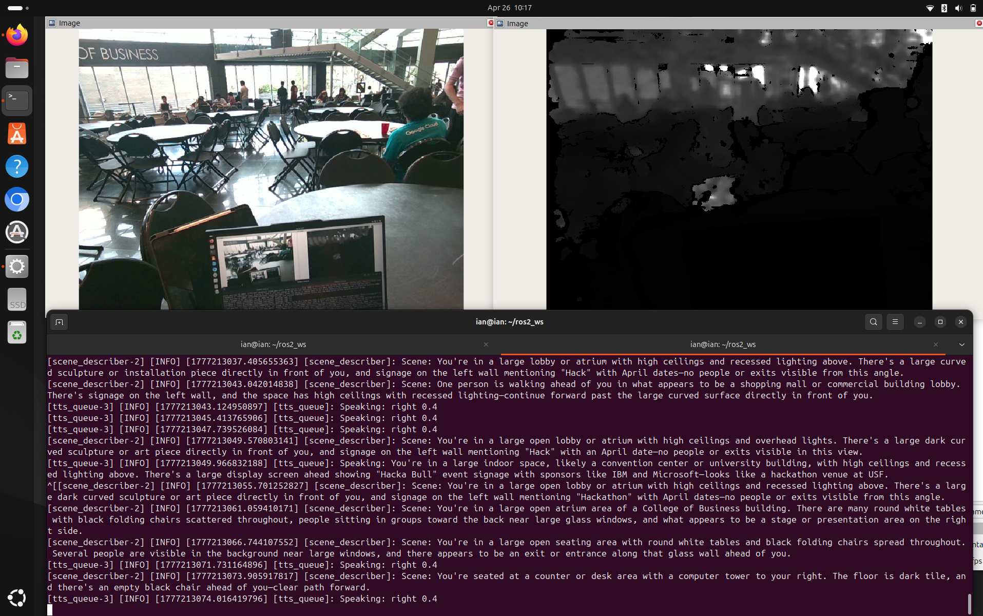 The entire pipeline runs on ROS2 Jazzy. The RealSense ROS2 driver streams depth and RGB topics which are consumed by two custom Python nodes. The obstacle detector uses NumPy to divide each depth frame into zones and finds the 5th percentile distance in each to filter noise. The scene describer encodes RGB frames as base64 JPEG and calls the Anthropic API. A third node manages the TTS queue using festival for audio output. The chest mount was 3D printed in PLA with a 30° downward tilt and strap attachment. Everything runs off a LiPo pack in the backpack.
