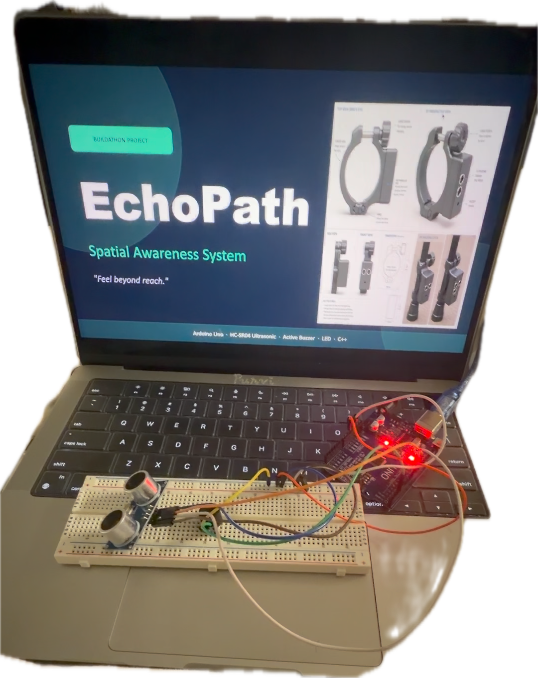 What it does: EchoPath clips onto any standard walking stick and uses an HC-SR04 ultrasonic sensor to continuously scan for obstacles up to 400cm away. An Arduino Uno runs a real-time risk classifier that categorizes the situation into SAFE, CAUTION, DANGER, or CRITICAL based on distance and approach speed. Each level fires a distinct buzzer pattern — silent when clear, slow beeps for a stationary object, fast beeps for a nearby hazard, and a rapid burst for critical distance — so the user understands urgency instantly without thinking about it.