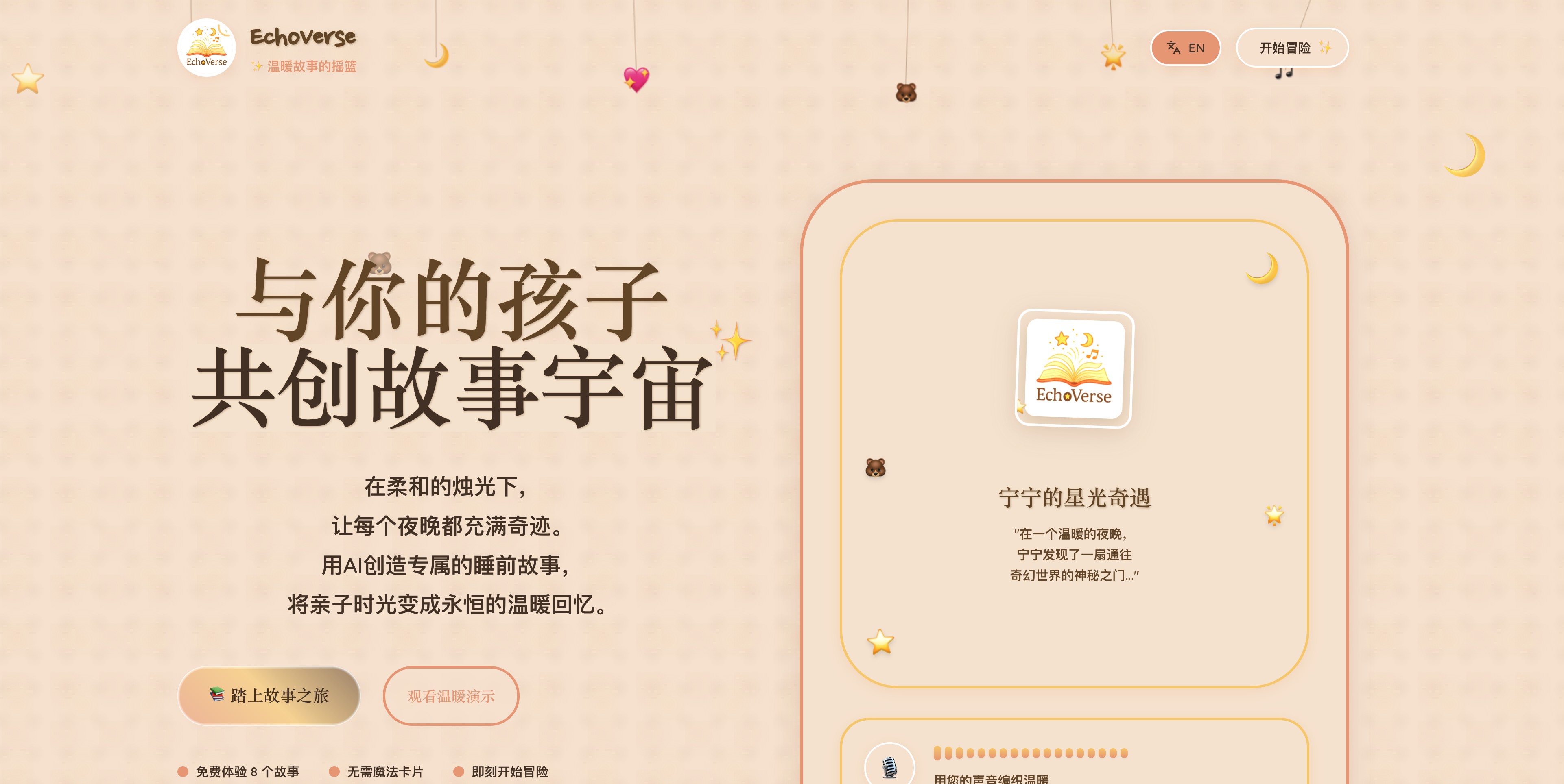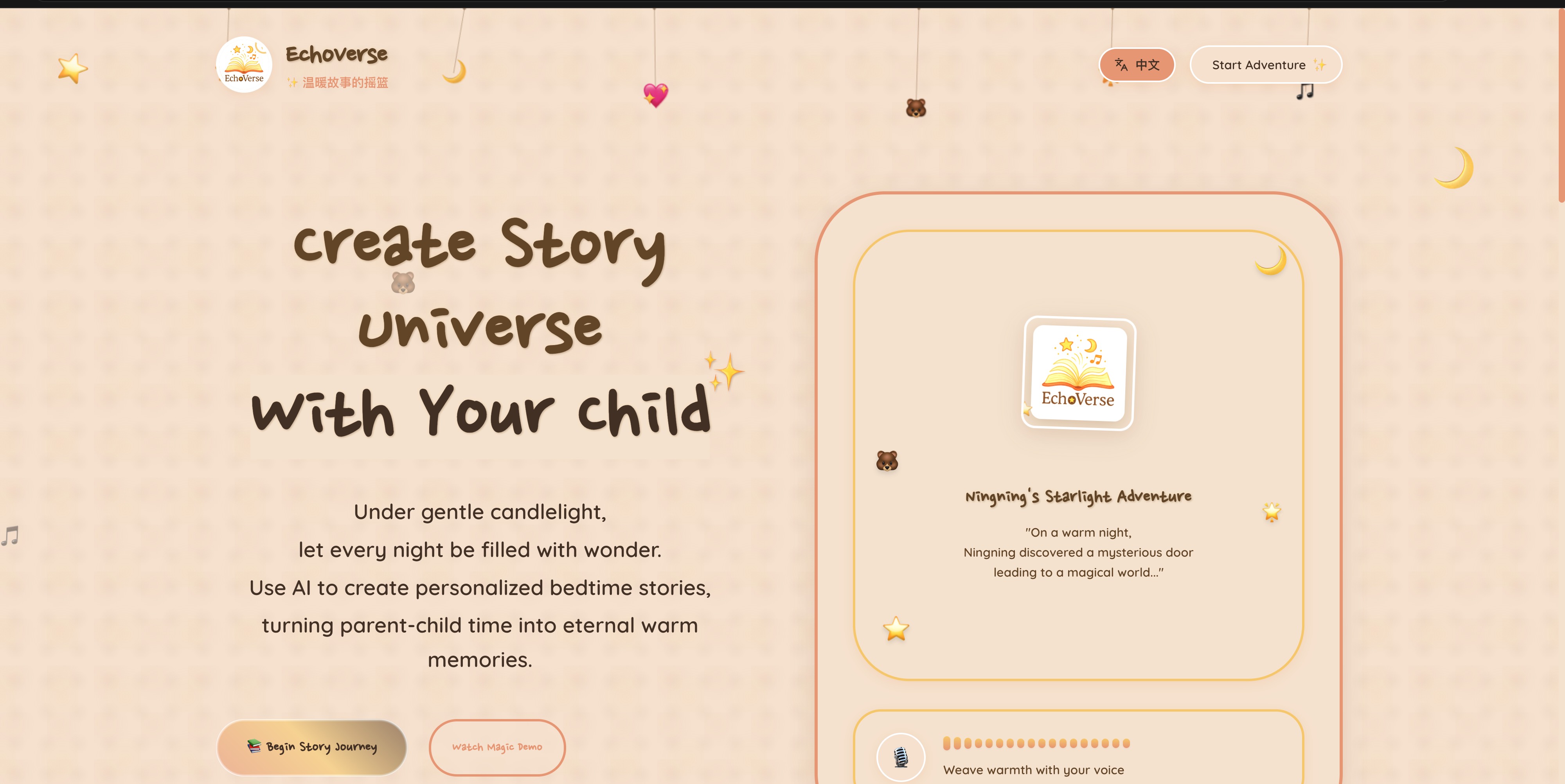 The inspiration for EchoVerse was born from this moment—I wanted to use the magic of AI to reignite the "story time" bond between parents and children, transforming it from a "duty" into a shared adventure of creation, connection, and love. My goal was not just to build a story generator, but a unique "emotional connector" for every family.