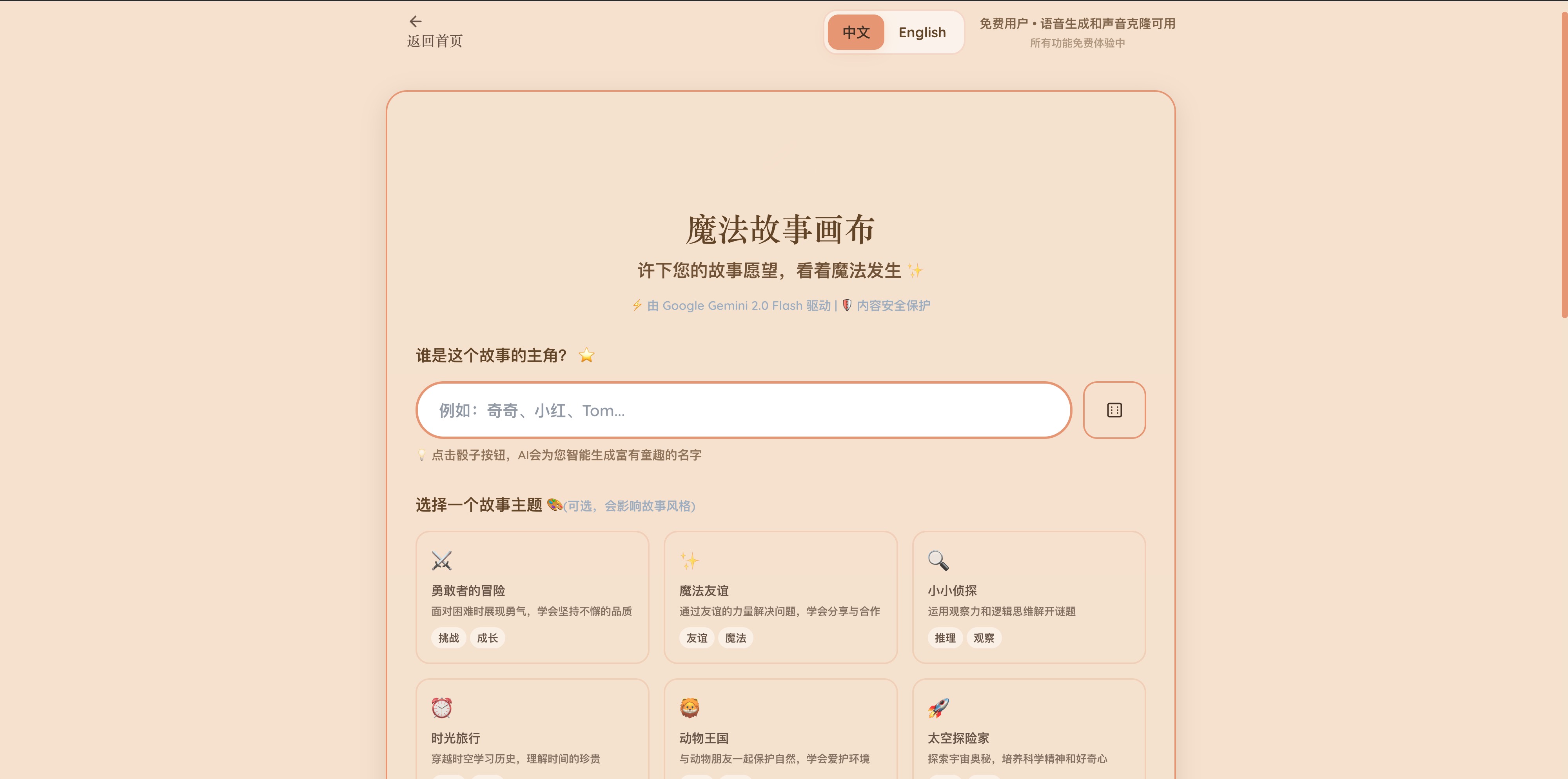 - The Magic Story Canvas: I abandoned complex forms in favor of an incredibly simple and intuitive creation interface. A user only needs to enter a protagonist's name and describe their idea in a natural sentence (e.g., "a story about a brave little lion searching for a rainbow"), and the AI can understand and create a complete story.