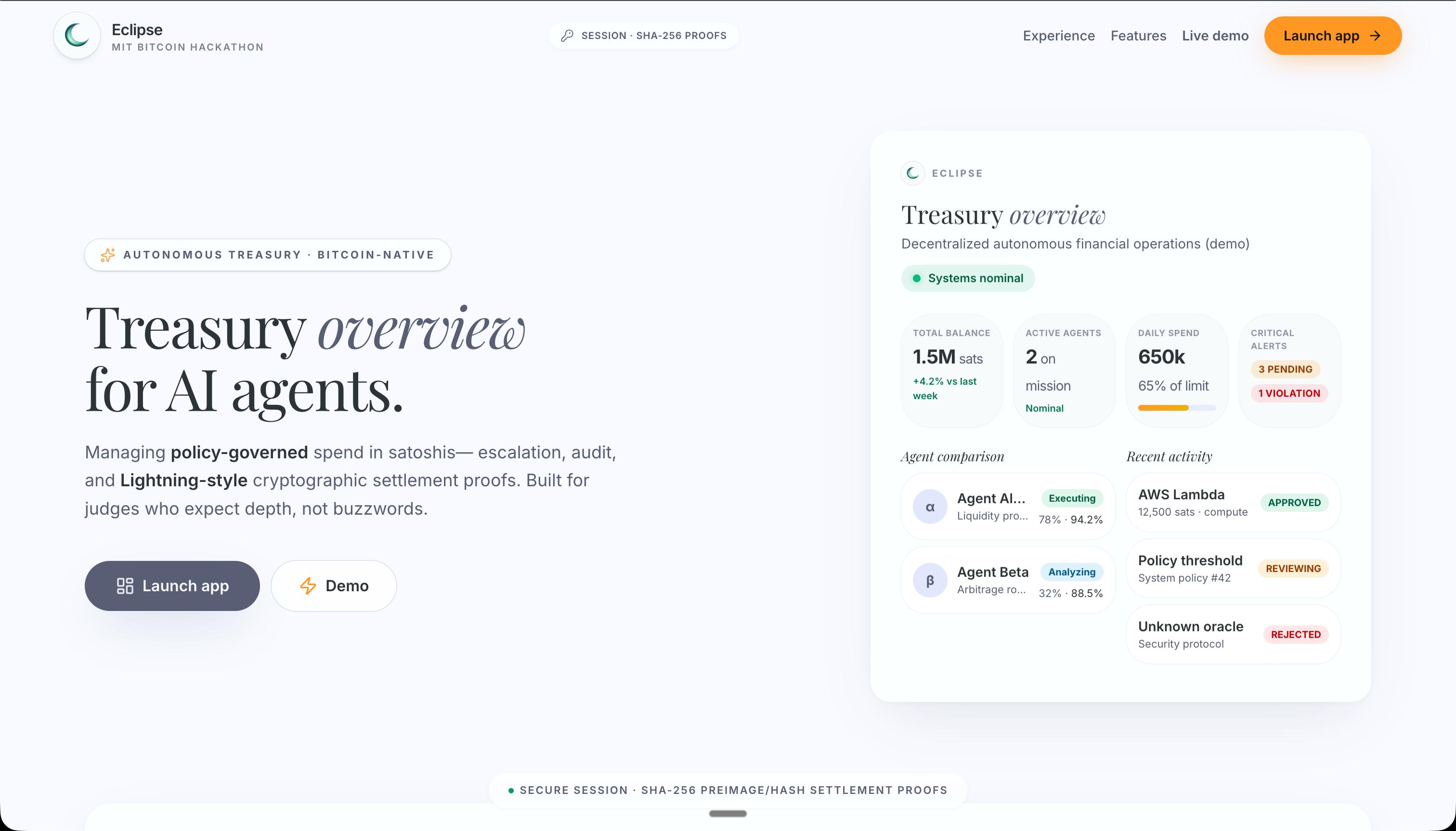 The agentic economy is arriving faster than the infrastructure to support it. AI agents are already making autonomous spending decisions — procuring cloud compute, subscribing to data feeds, paying for API access — and the rails they're using offer zero governance. There's no policy enforcement layer, no privacy-tiered audit trail, and no cryptographic settlement that a third party can independently verify. We asked a simple question: if an AI agent decides to spend $50,000 at 2 AM, what stops it? The answer today is nothing. Eclipse is our answer to that gap — a policy-controlled Bitcoin treasury where the agent proposes, deterministic rules decide, and settlement is verifiable on-chain.