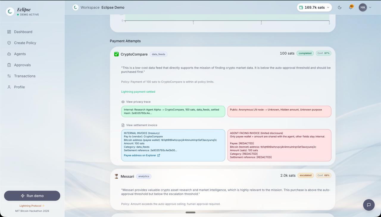 Eclipse is a policy-controlled Bitcoin treasury for AI agents. It enforces deterministic spending rules on every autonomous payment, settles approved transactions on Bitcoin testnet, and provides privacy-tiered audit trails for internal teams and external parties.