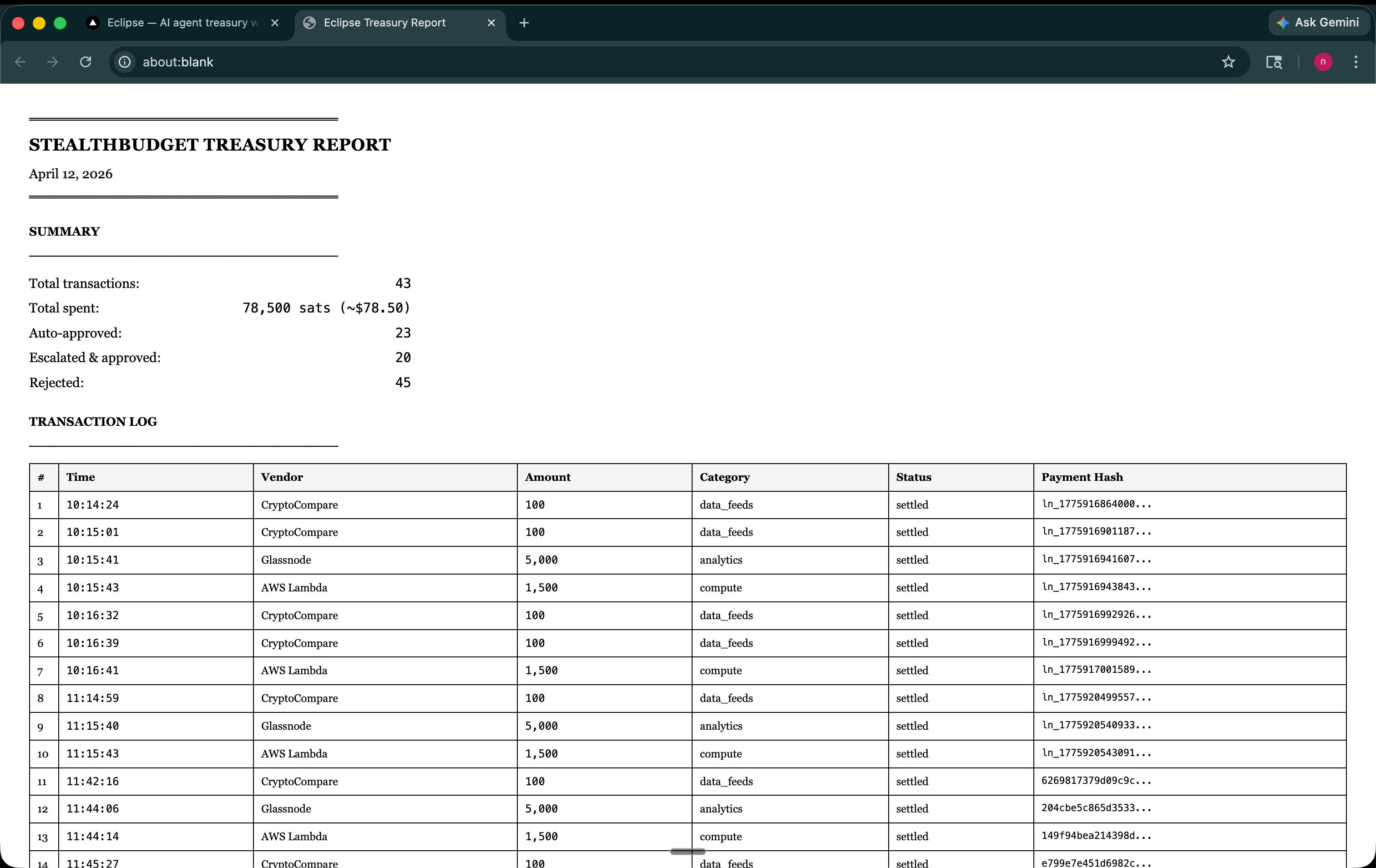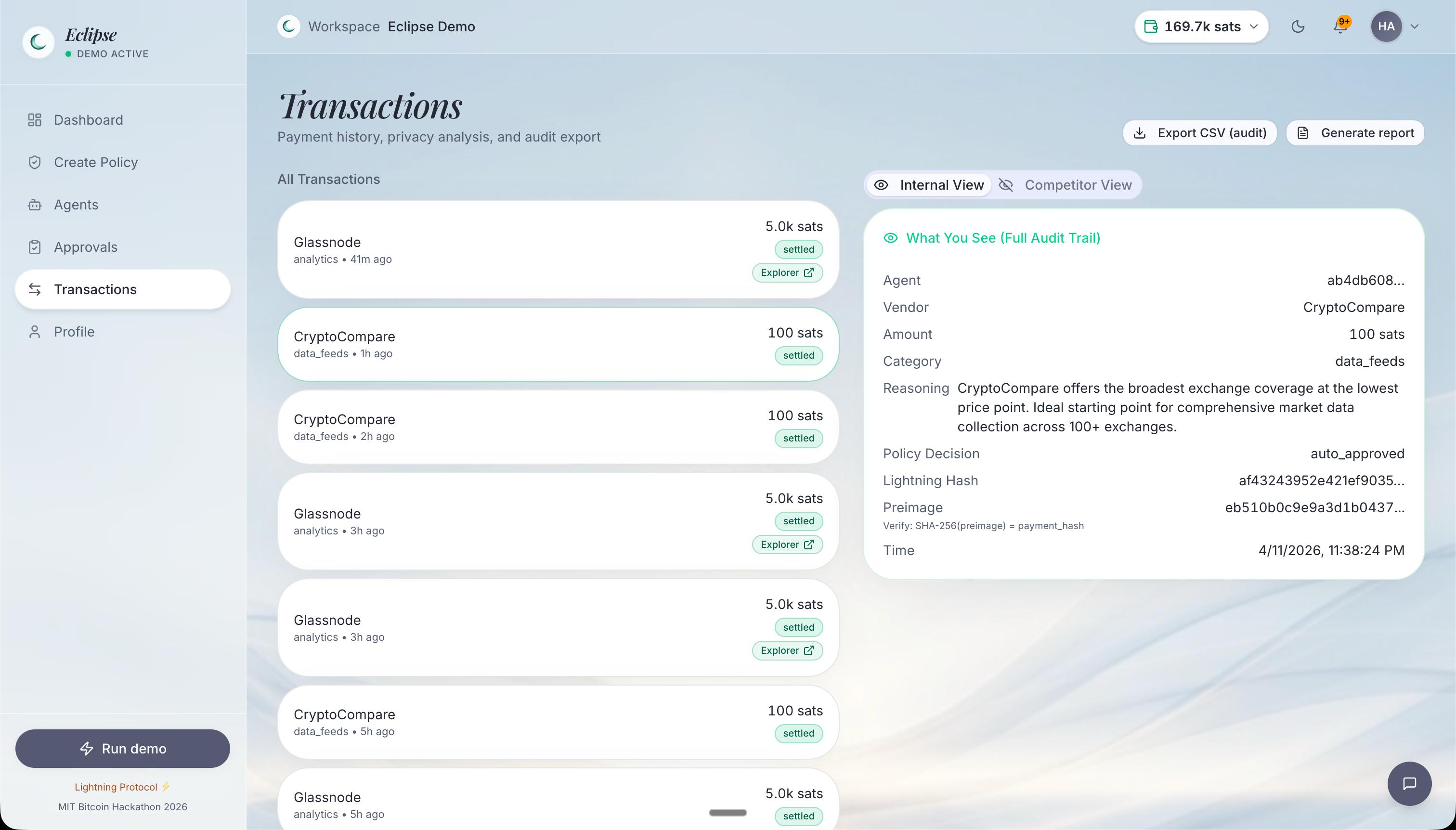 Dashboard with live treasury balance (reading from Bitcoin testnet wallet), daily spend vs. cap tracking, pending approvals, and policy violation alerts — all auto-refreshing. Create Policy page with configurable sliders for budget, per-tx limit, daily cap, escalation threshold, auto-approve ceiling, and allowed spending categories. Agent Missions where Gemini reasons through vendor payments, with every proposal evaluated by the policy engine before settlement. Privacy Traces — each payment has an internal invoice (full vendor, amount, category, Bitcoin address, explorer link) and an agent-facing invoice (payee redacted, category redacted, settlement reference redacted). Same transaction, two trust levels. Approval Queue for escalated payments with agent reasoning, escalation triggers, reviewer comments, and approve/reject controls — human-in-the-loop for anything above threshold. Transactions page with Internal View (full audit trail including SHA-256 hash and preimage verification) and Competitor View (all sensitive data hashed). On-chain verification — treasury address viewable on mempool.space with balance history showing sats leaving the wallet as agents spend. Export & Compliance — CSV export of the full ledger and printable treasury report with every transaction, vendor, amount, category, status, and payment hash. Eclipse Help — in-app AI assistant that explains policy and treasury operations.