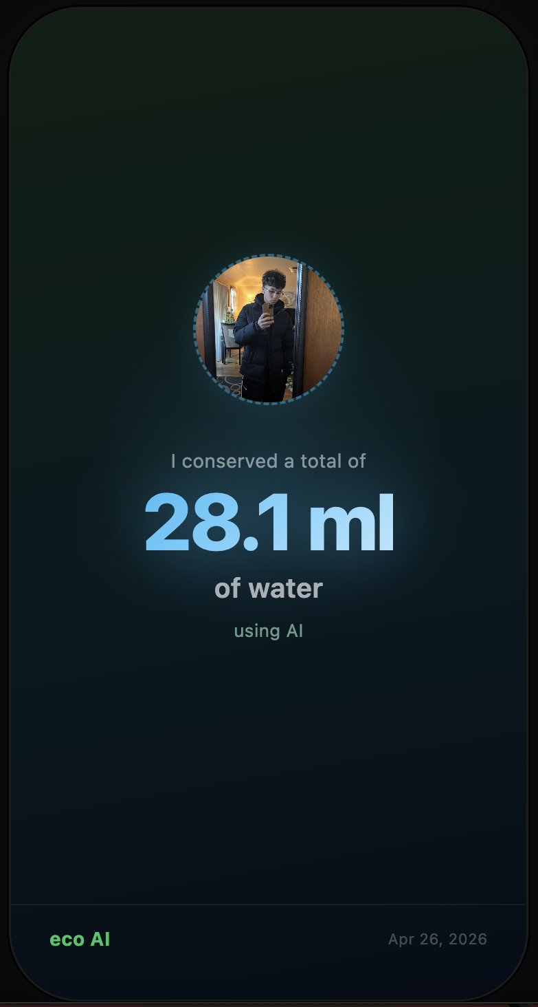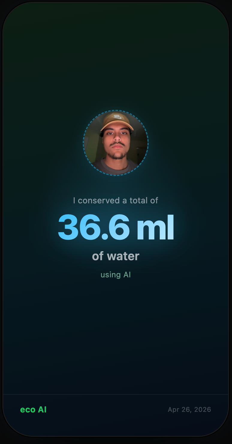 Another thing we are proud of is creating a feature where you can share a screenshot of your conserved water amount using AI in a instagram story post style to potentially spread awareness of the movement and with more people participating in using eco AI the bigger the impact it makes to the environments natural resources like water.